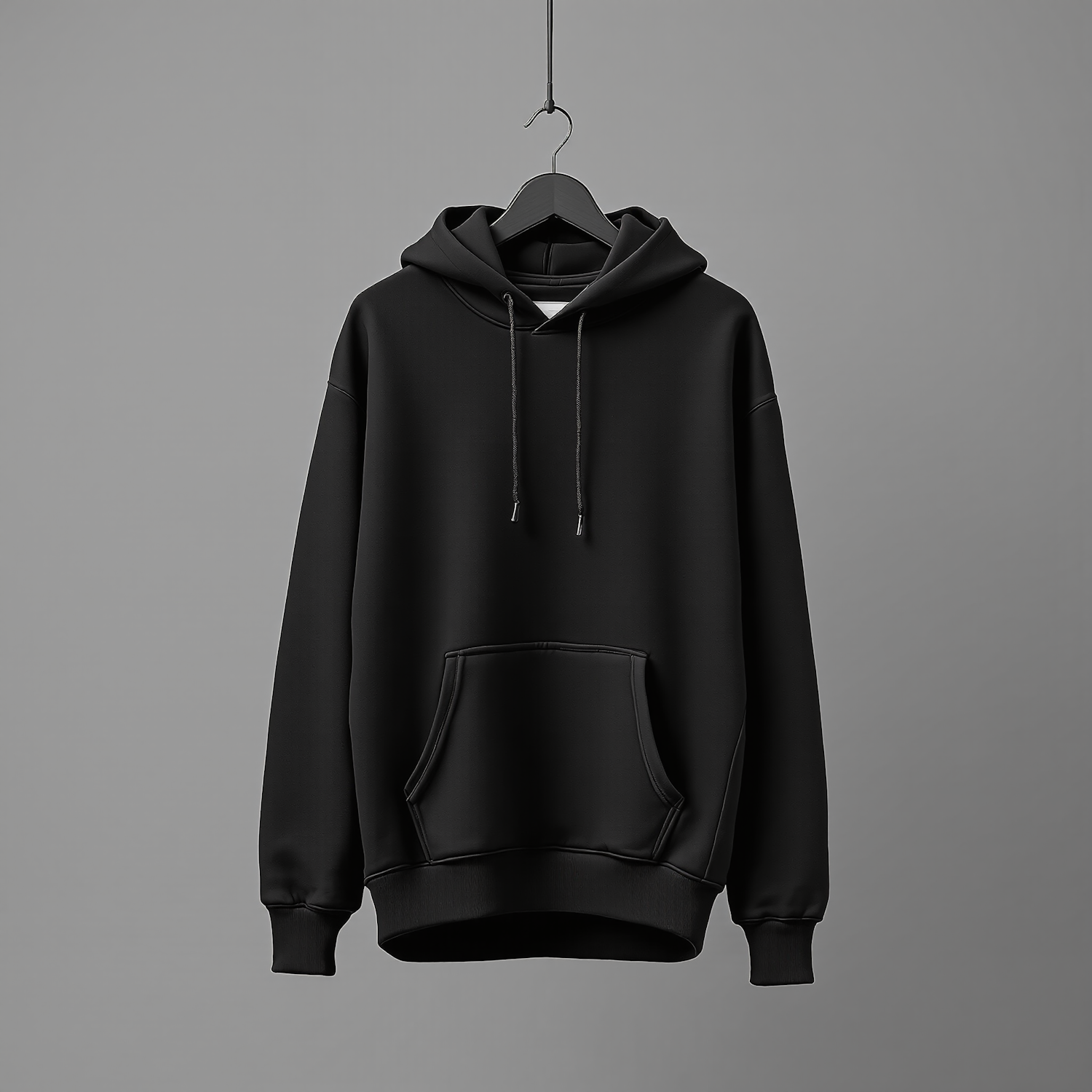 A sleek black hoodie with a front pocket and drawstrings, hanging on a simple hanger against a neutral gray background.