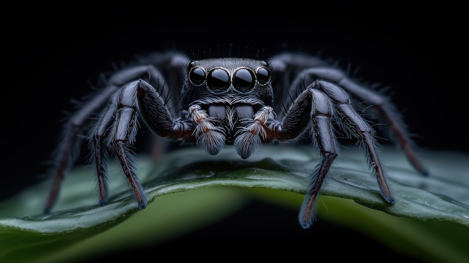 Stunning macro shot of a black jumping spider with glossy eyes on a green leaf, set against a dark, blurred background.