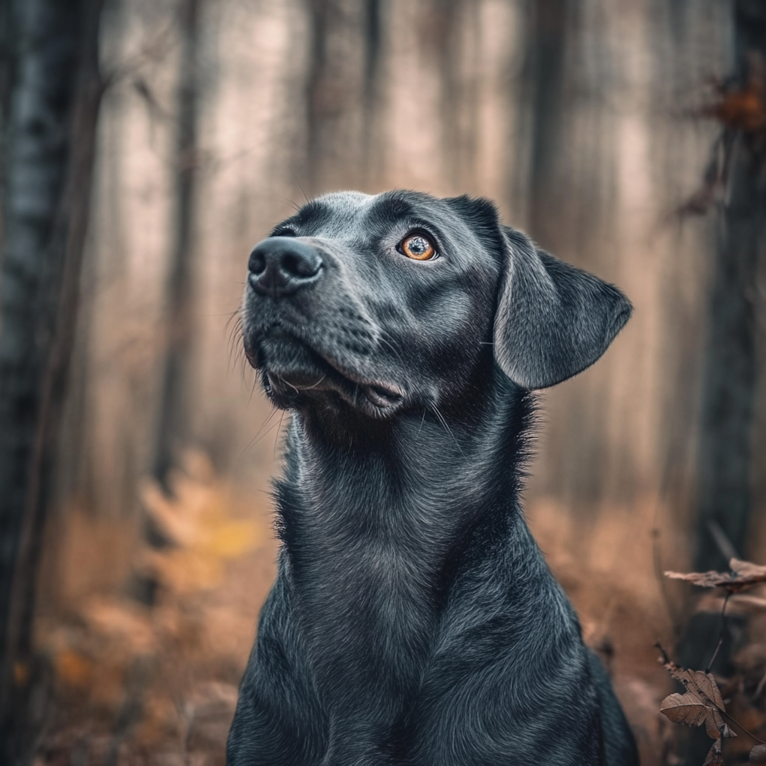 Black Labrador Retriever with glossy coat and expressive eyes in a serene forest setting, surrounded by autumn leaves and tall trees.