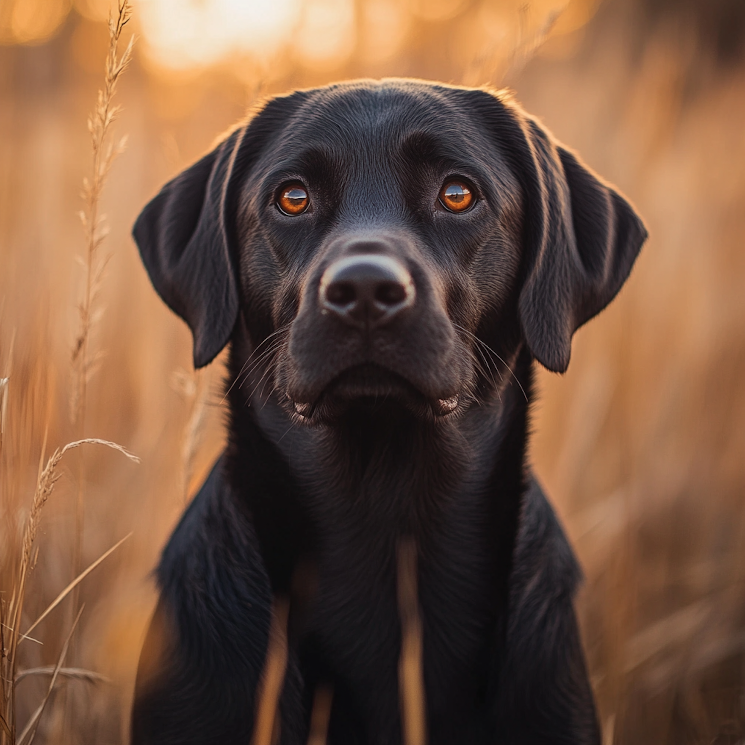 Close-up of a black Labrador Retriever with amber eyes in a golden field, bathed in warm sunlight. Perfect for dog lovers and nature enthusiasts.