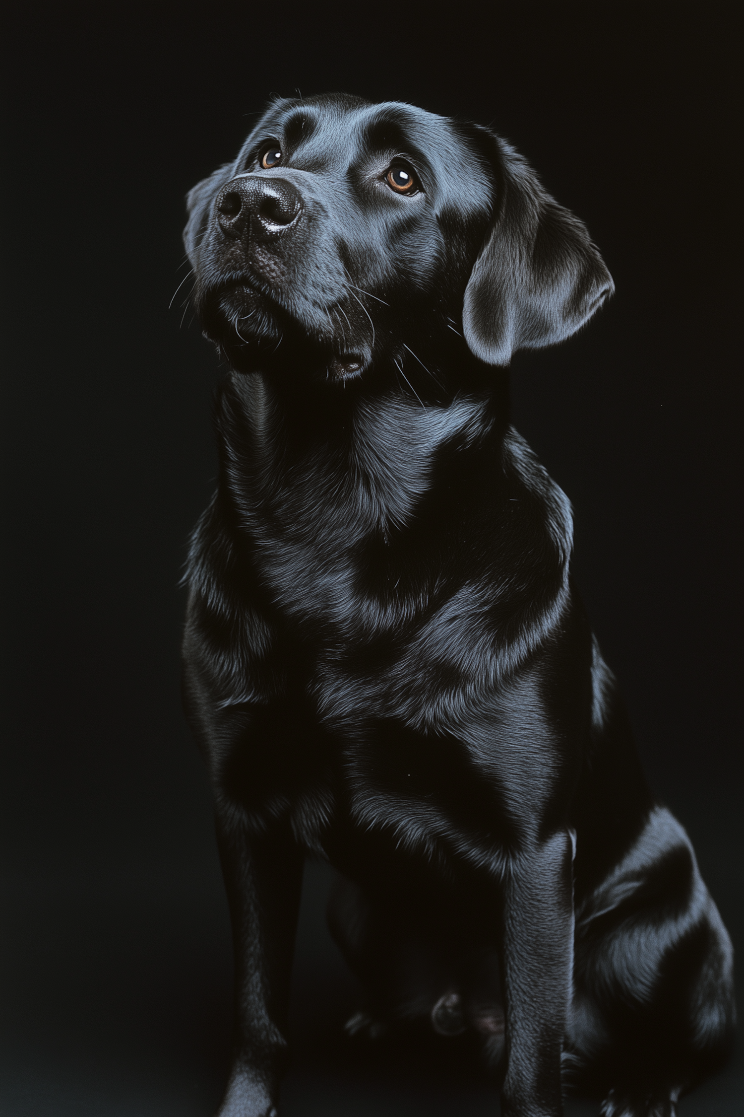 Elegant black Labrador Retriever with glossy coat and warm brown eyes, sitting against a dark background, exuding calm and grace.