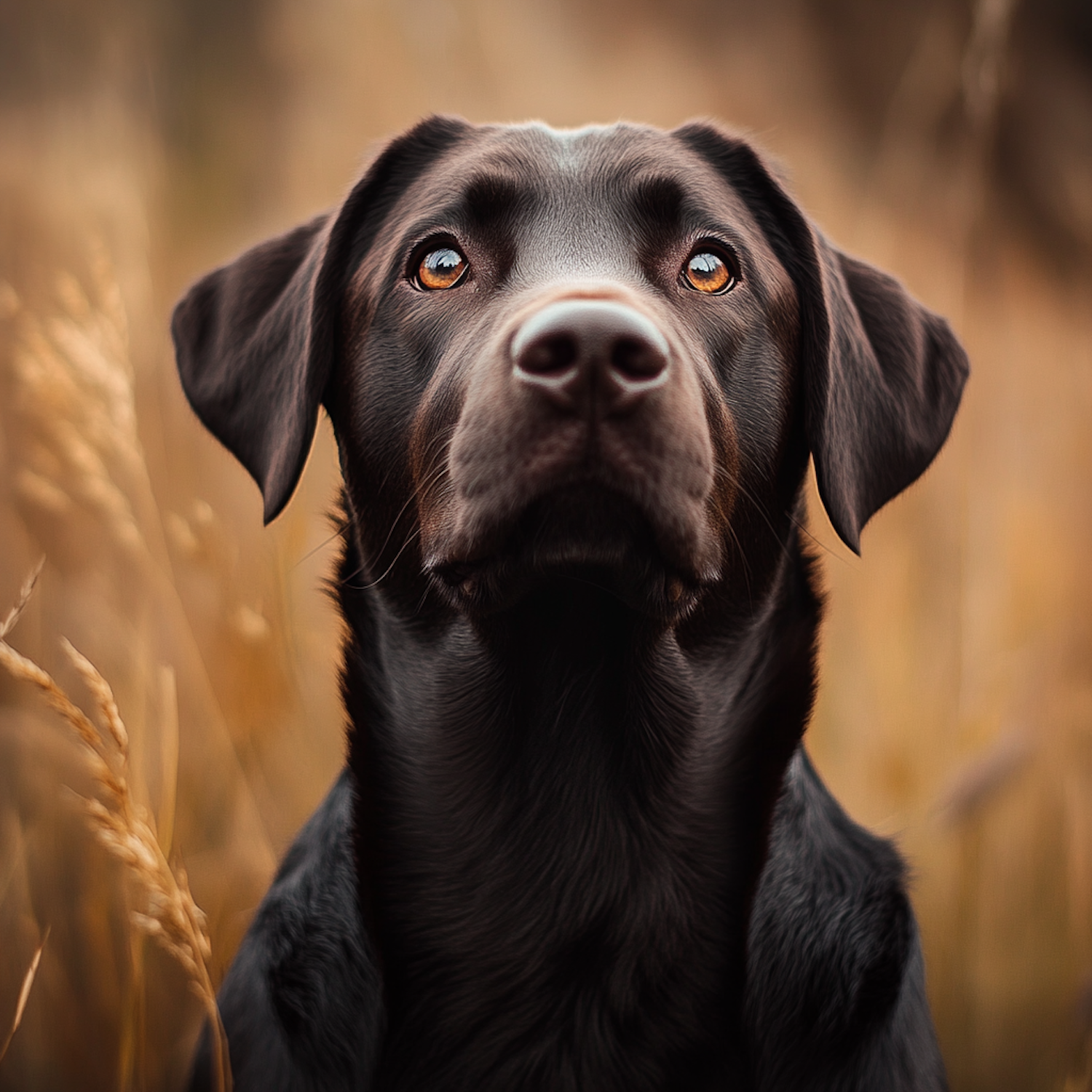 Close-up of a black Labrador Retriever with amber eyes, gazing upward in a golden field of tall grass. Warm, natural tones dominate the scene.