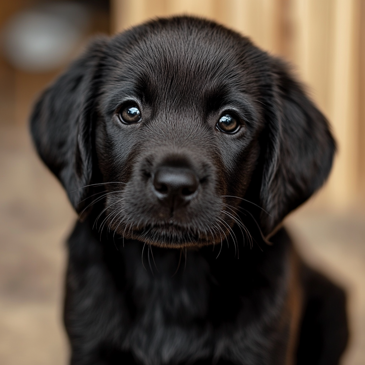 Adorable black Labrador Retriever puppy with shiny fur and gentle eyes, set against a softly blurred background.