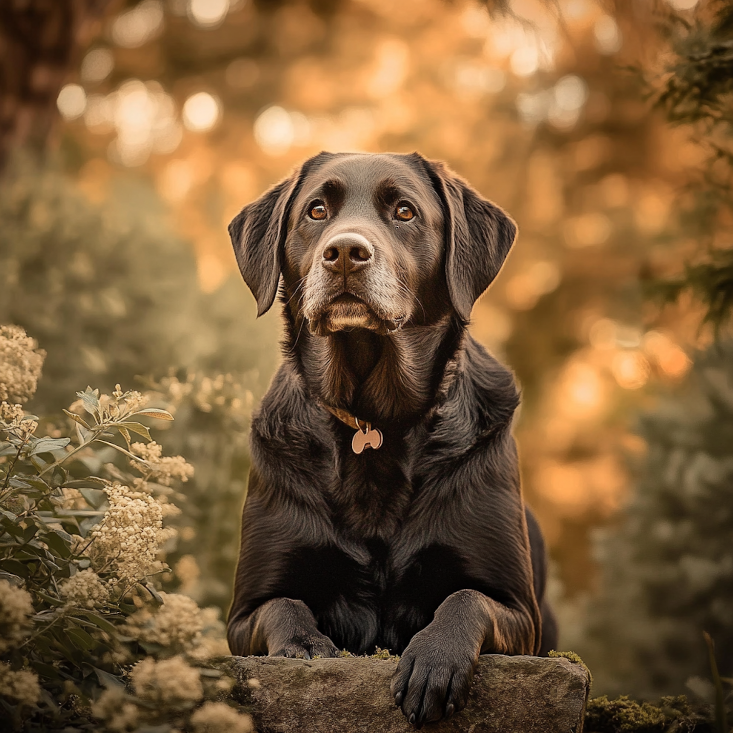 A mature black Labrador Retriever lies on a stone, surrounded by greenery and a warm, golden background, creating a serene scene.