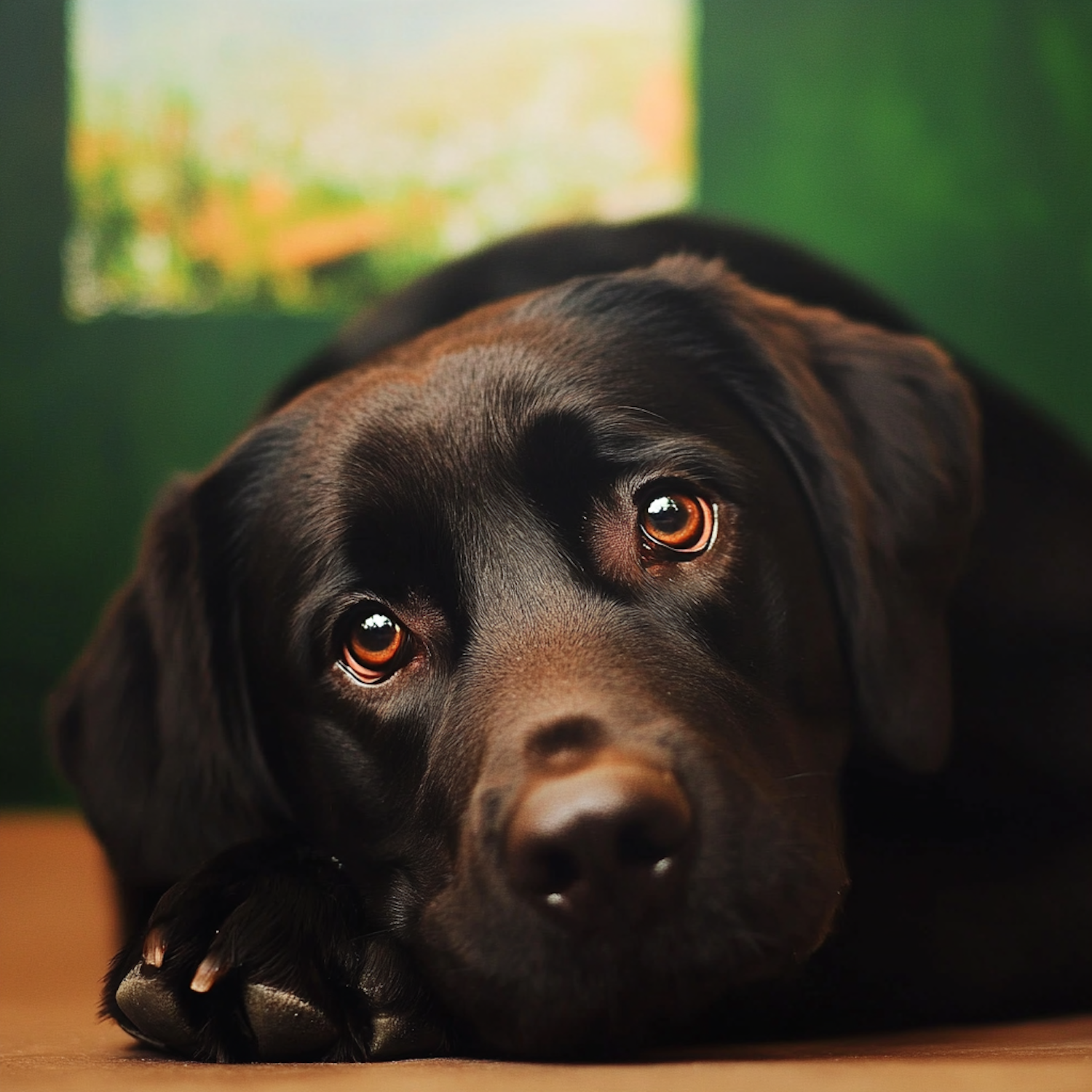 Close-up of a black Labrador Retriever with expressive brown eyes, resting its head on its paws against a soft-focus green background.
