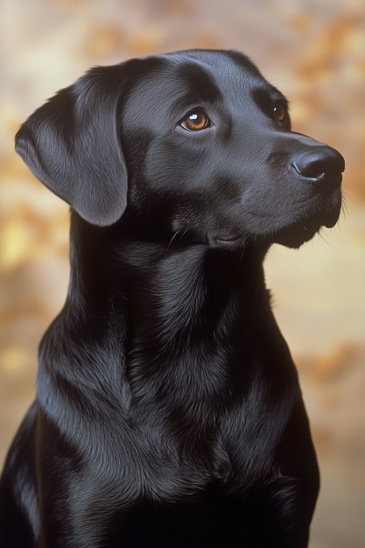 Close-up of a black Labrador Retriever with glossy fur and expressive brown eyes against a warm, blurred background.
