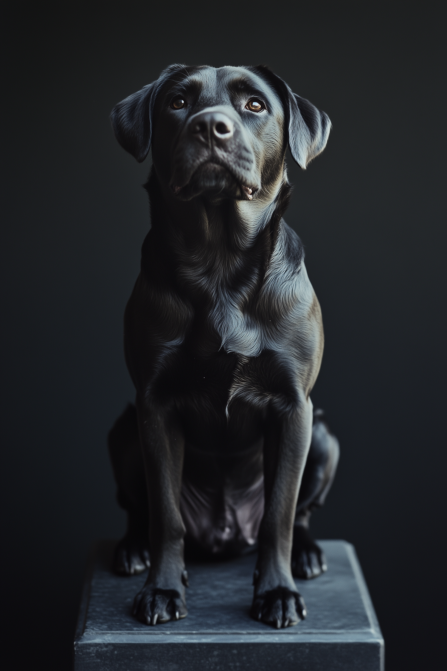 Black Labrador Retriever sitting on a dark platform, glossy coat, dramatic lighting, black background.
