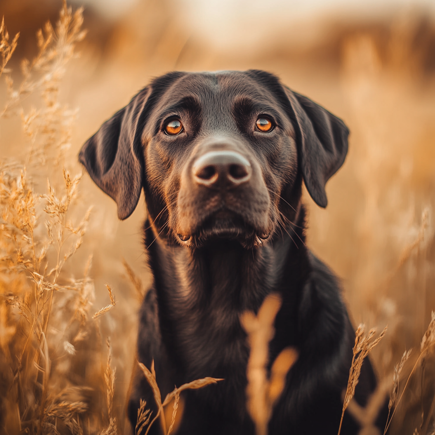 A black Labrador Retriever with amber eyes in a golden field at sunset, creating a serene and warm outdoor scene.