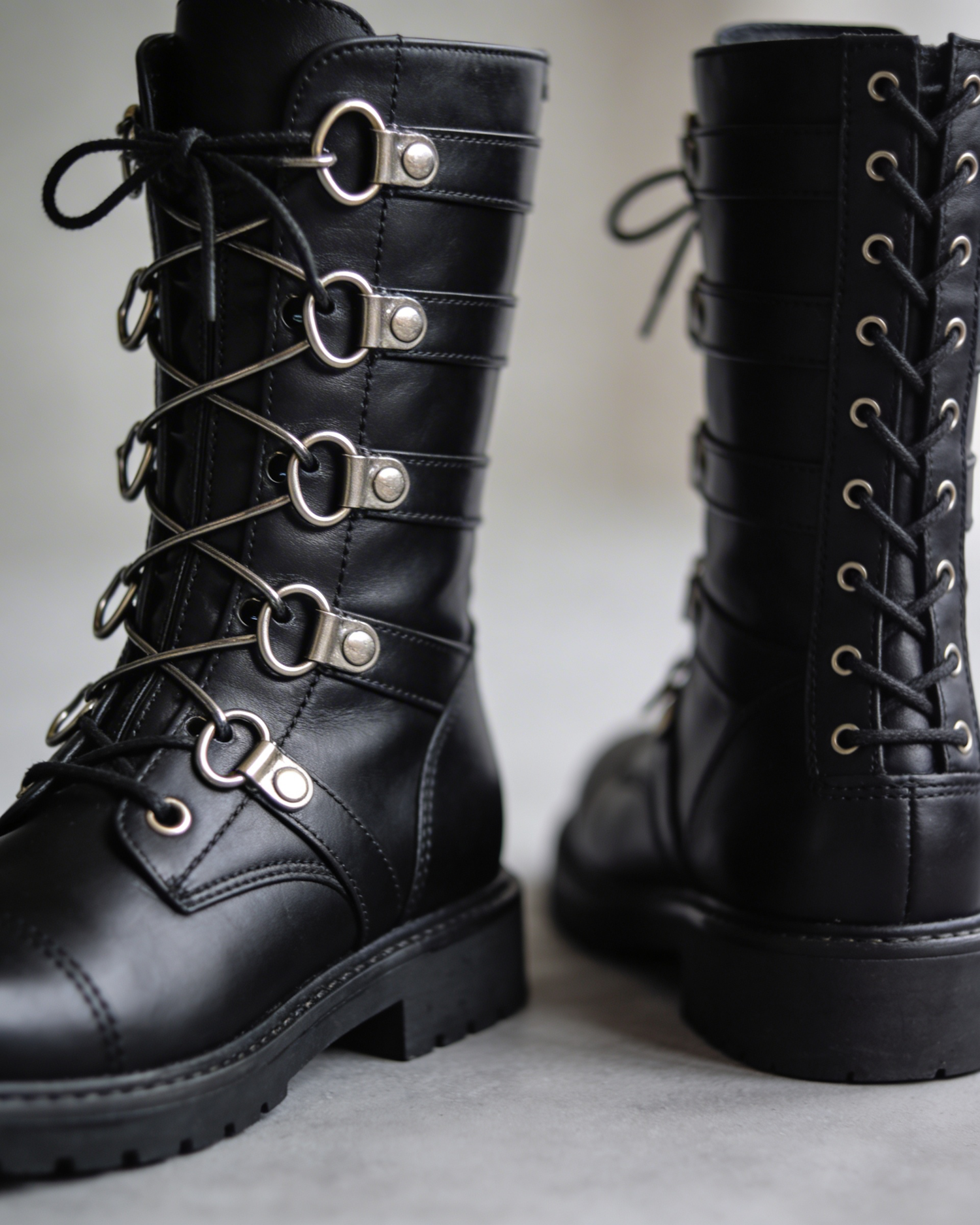 Stylish black leather boots with silver eyelets and rugged soles, perfect for a bold and durable footwear choice.