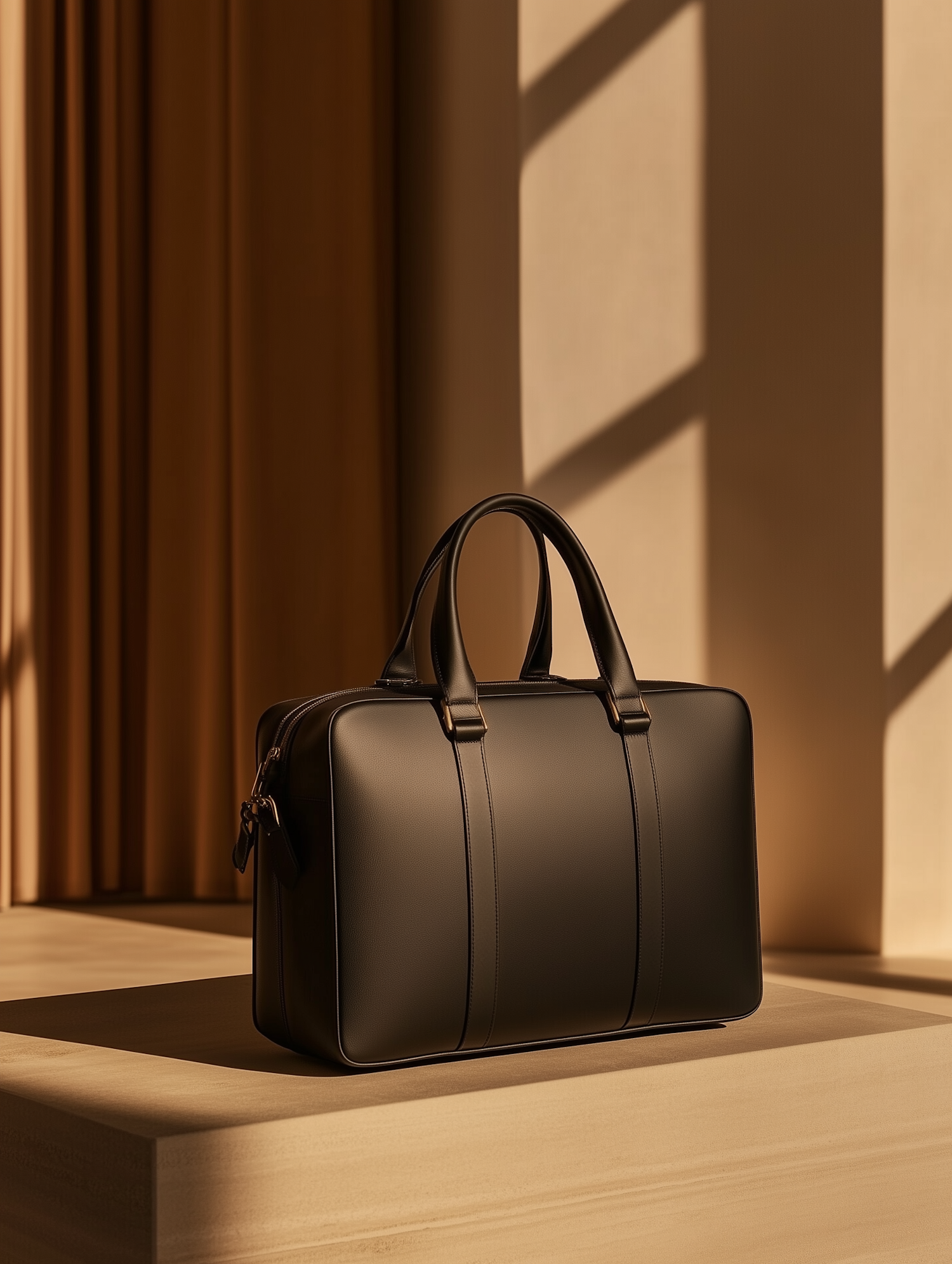 Sleek black leather briefcase on a wooden surface, bathed in warm sunlight with elegant shadows and minimalist design details.
