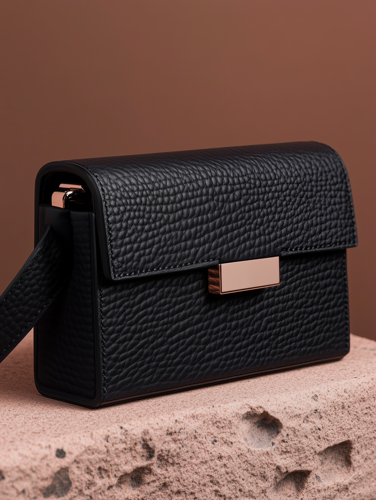 Elegant black leather handbag with gold clasp, pebbled texture, and structured design, set against a warm brown background.