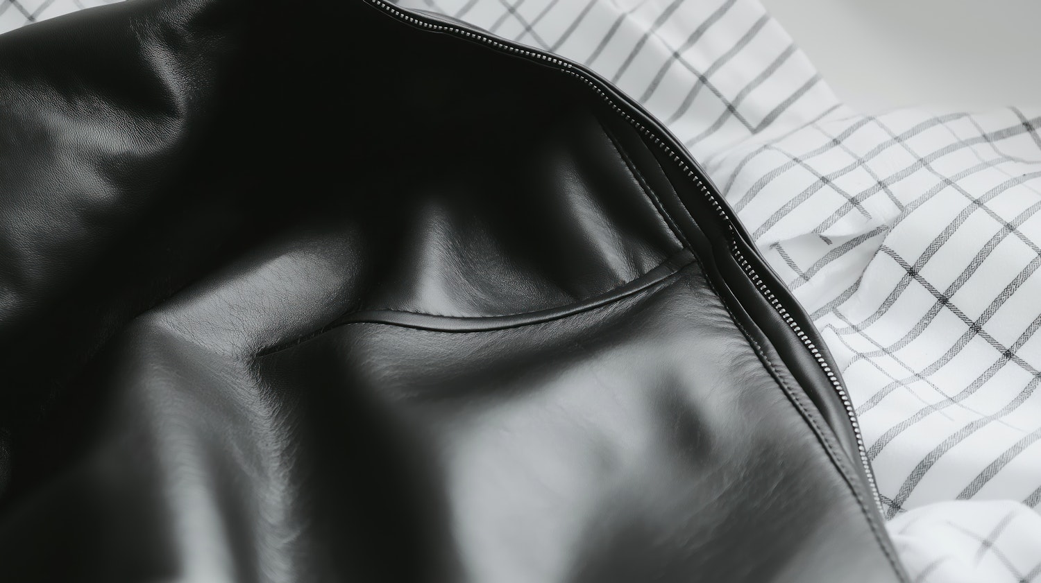 Close-up of a black leather jacket with a glossy finish, detailed stitching, and a visible pocket, set against a white grid-patterned fabric.