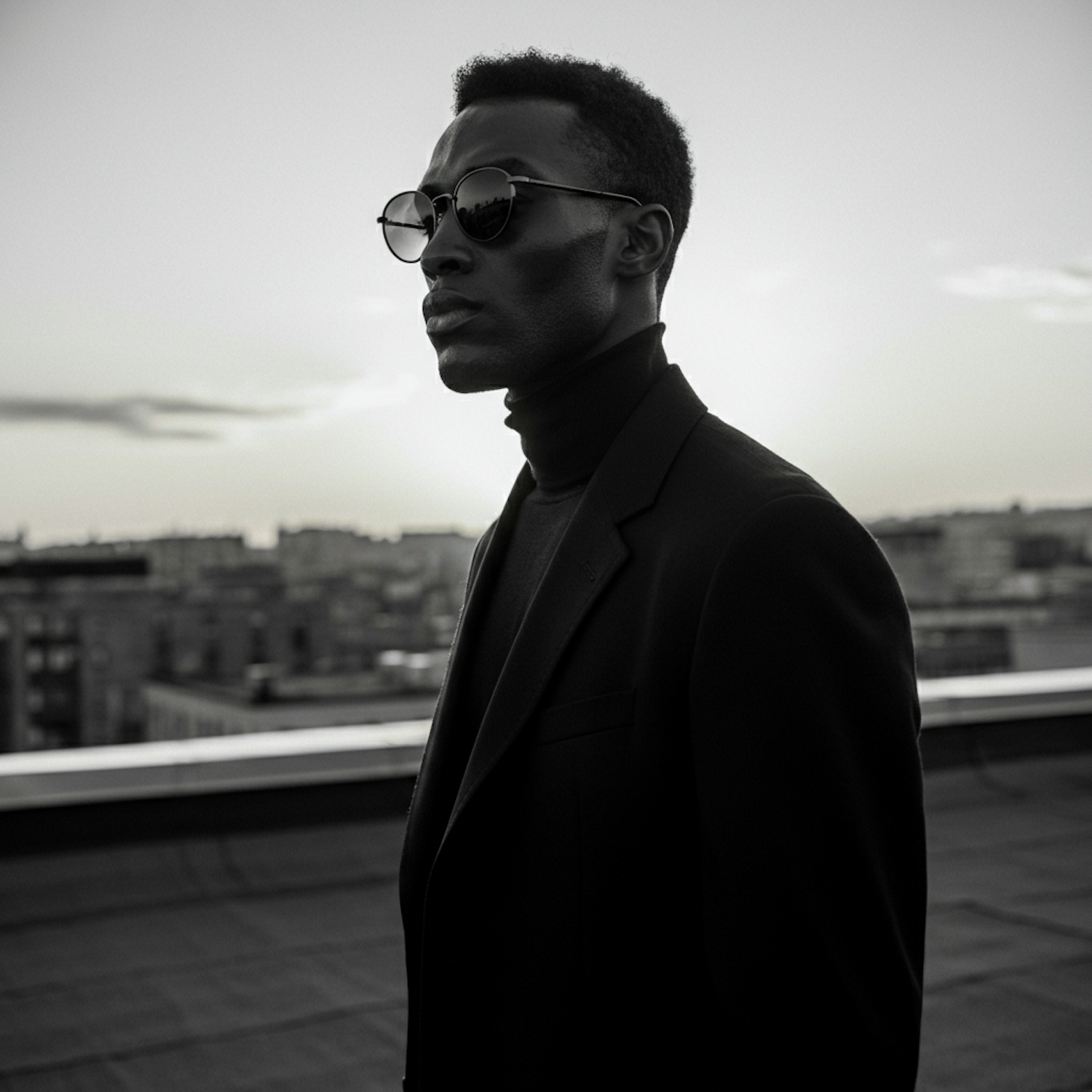 Stylish black man in sunglasses on a rooftop, cityscape backdrop, dramatic silhouette in black and white.