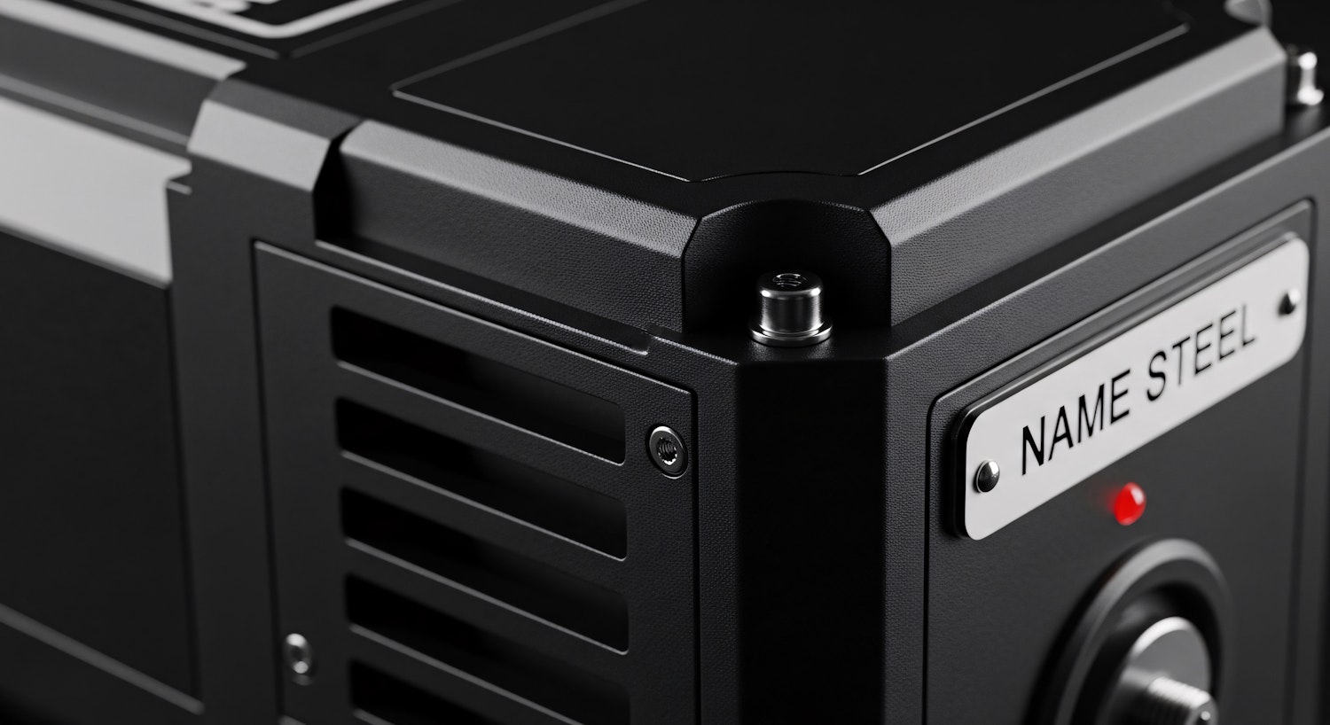 Close-up of a sleek black industrial device with a 'NAME STEEL' nameplate, vented panel, and red indicator light, showcasing precision design.