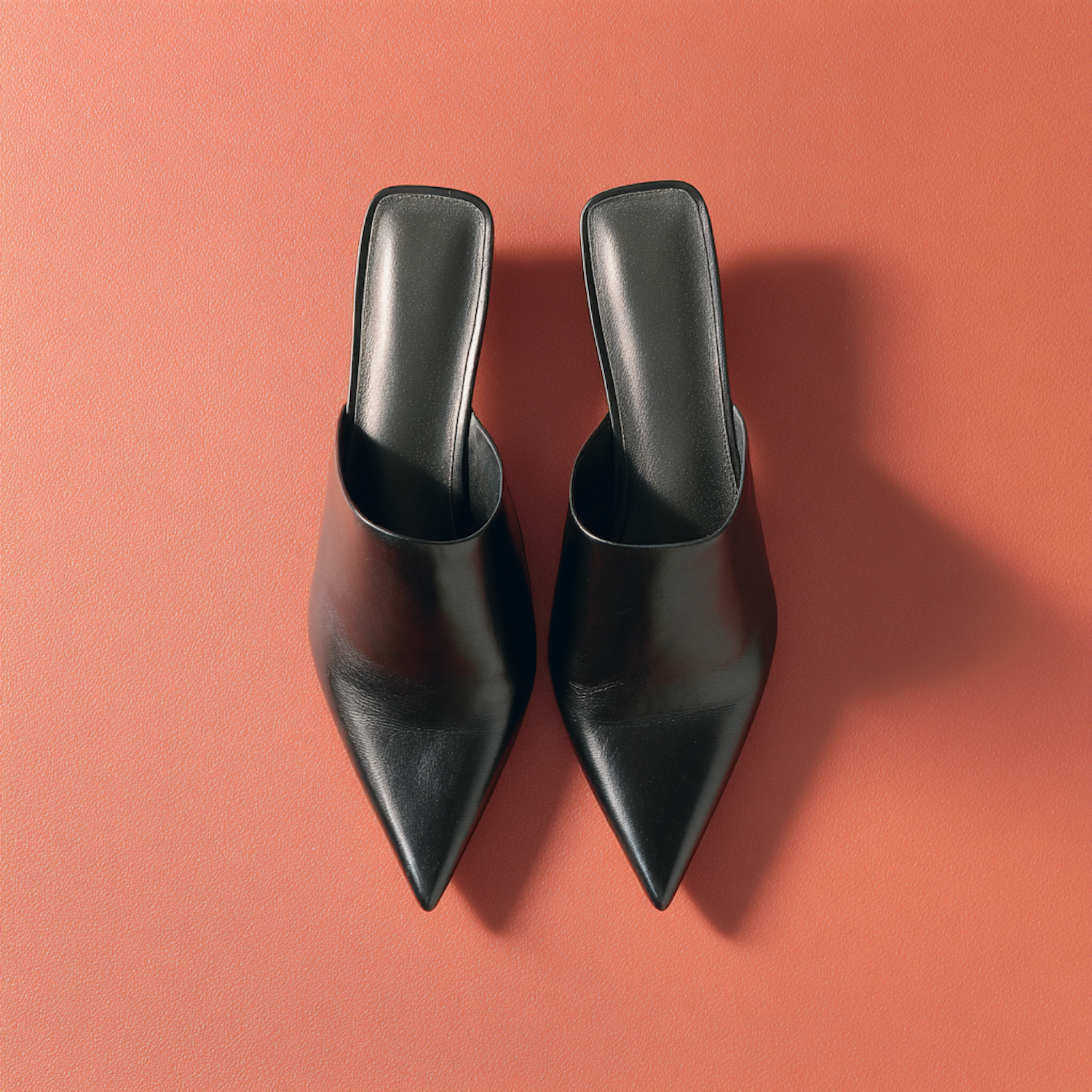 Elegant black pointed-toe mules on a coral background, showcasing a minimalist and modern design with a smooth leather finish.