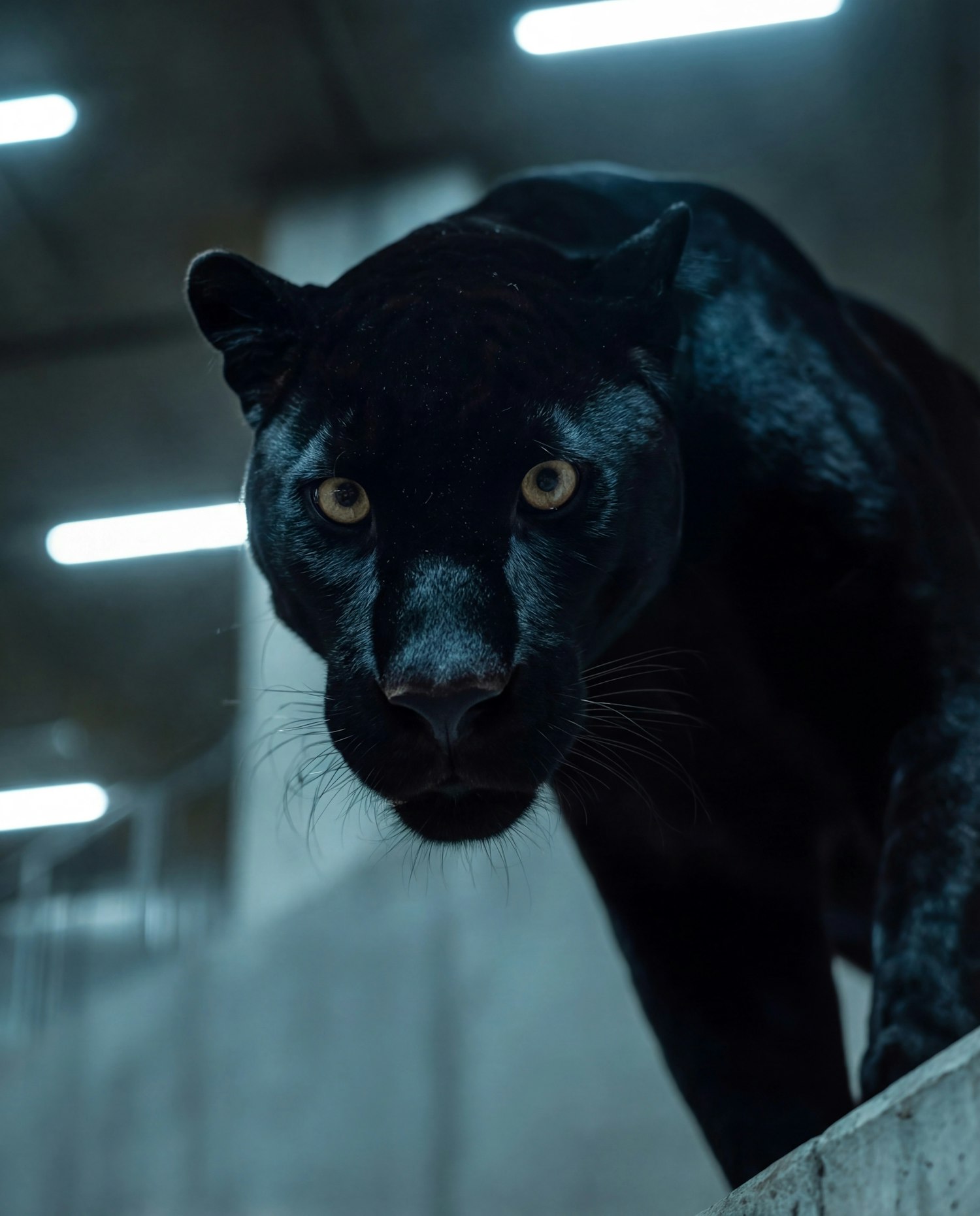 A black panther with piercing yellow eyes in a dimly lit industrial setting, showcasing its sleek fur and intense gaze.
