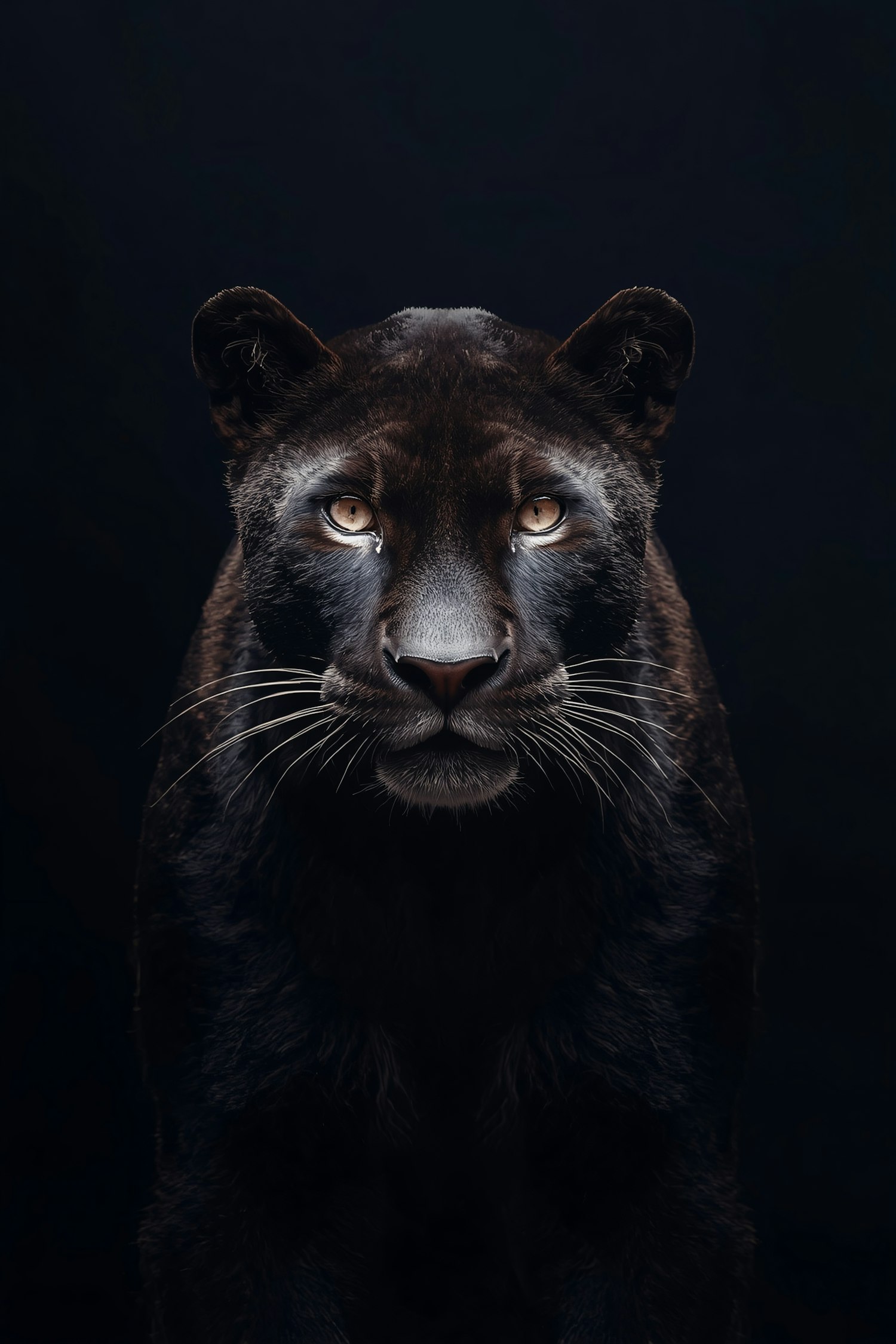 A stunning close-up of a black panther with piercing golden eyes, set against a dark background, showcasing its sleek fur and intense gaze.