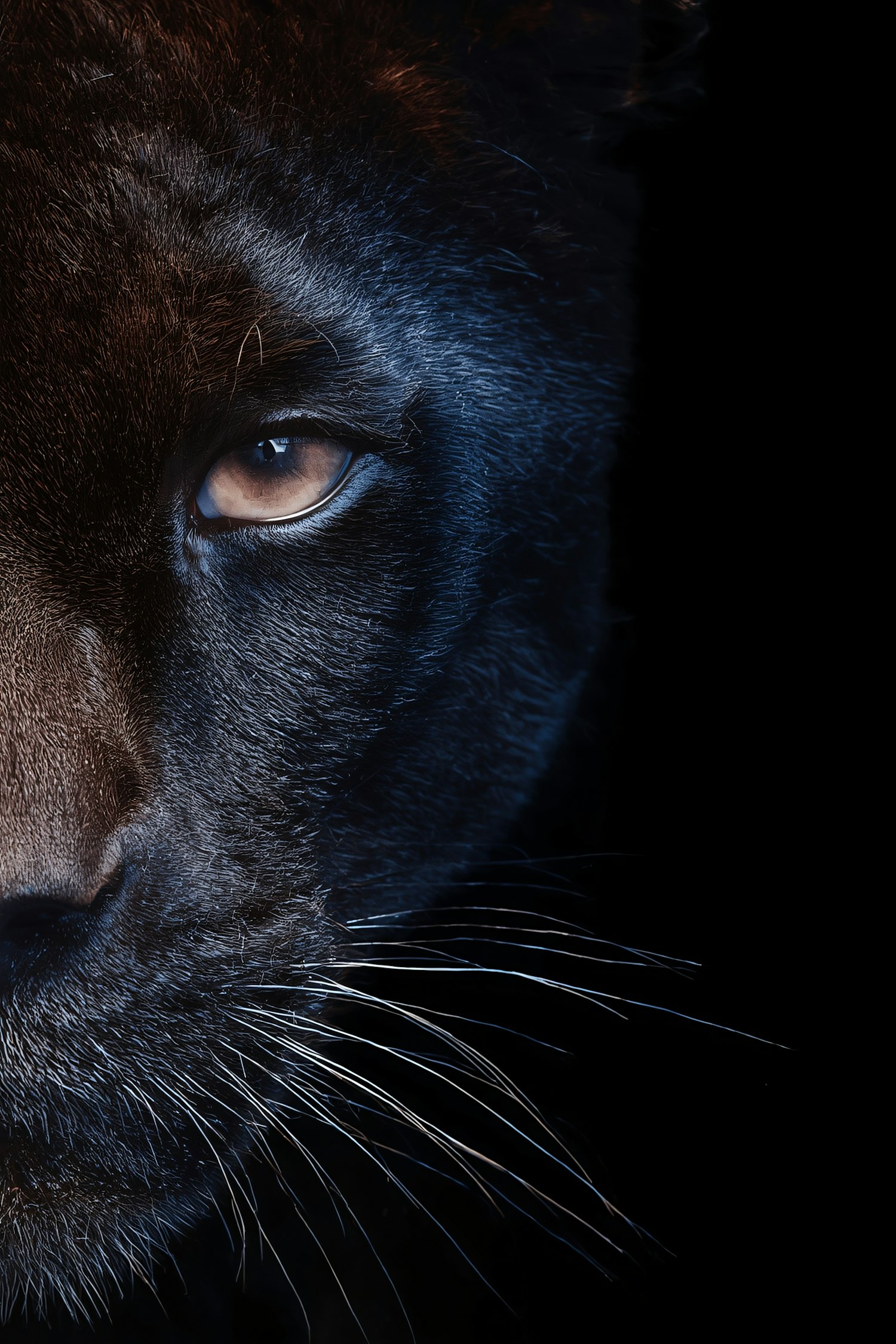 Close-up of a black panther's face, highlighting its amber eye and sleek fur against a dark background.