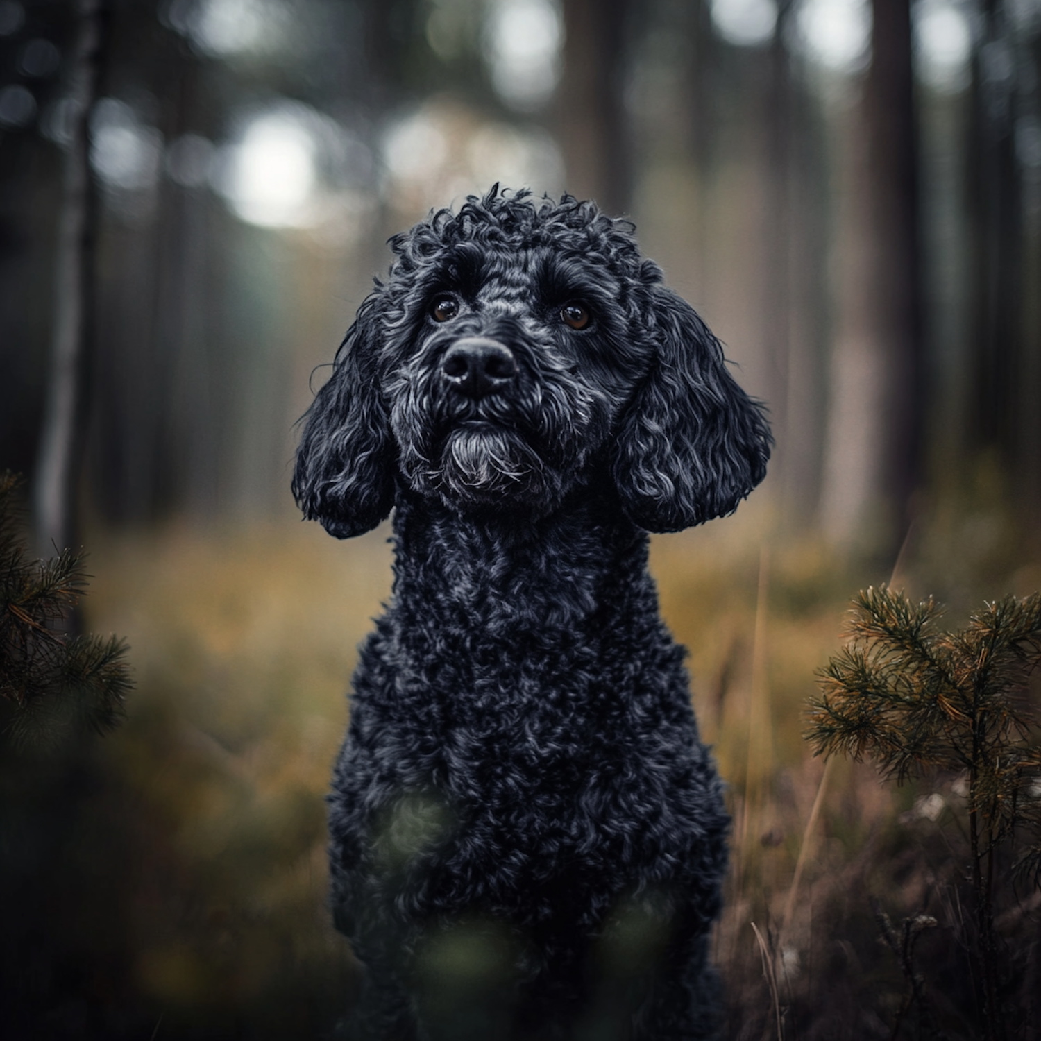 Adorable black curly-haired dog sitting in a serene forest, surrounded by soft light and earthy tones. Perfect for nature and pet lovers.