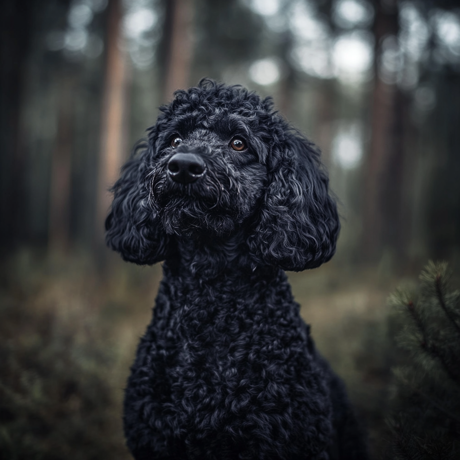 Adorable black poodle with curly fur in a serene forest setting, gazing upward with expressive brown eyes. Perfect for dog lovers!