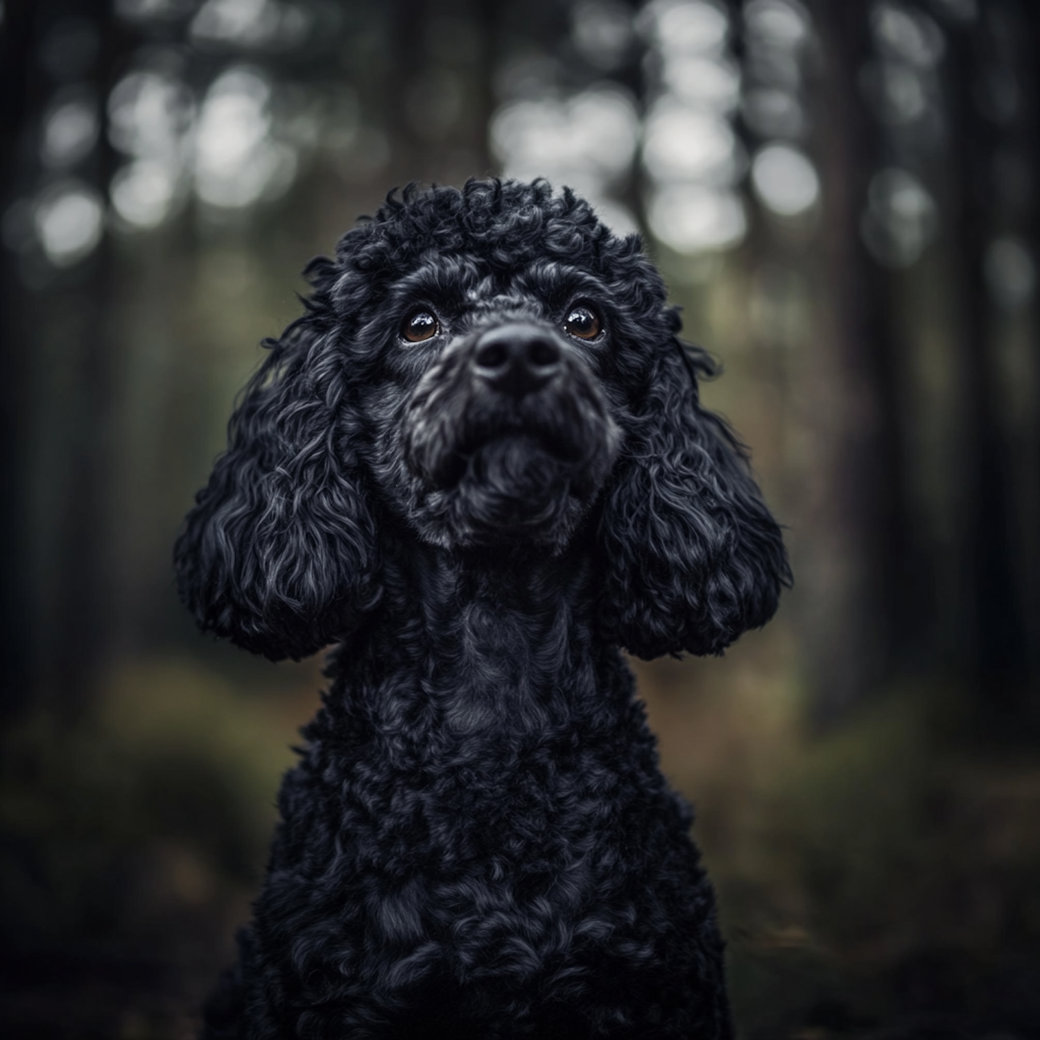 Close-up of a black poodle with curly fur and expressive eyes, set against a blurred forest background. A serene and thoughtful moment.
