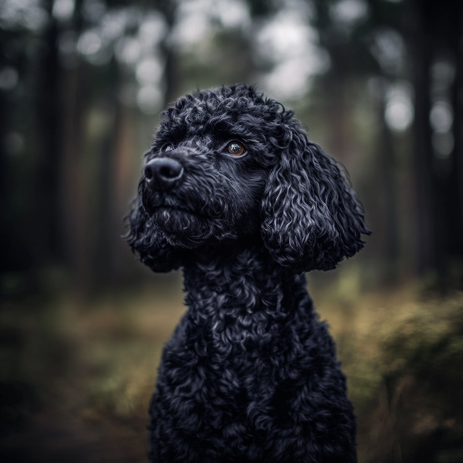 Close-up of a black poodle with curly fur in a forest, its calm gaze and soft lighting highlighting its elegant features.