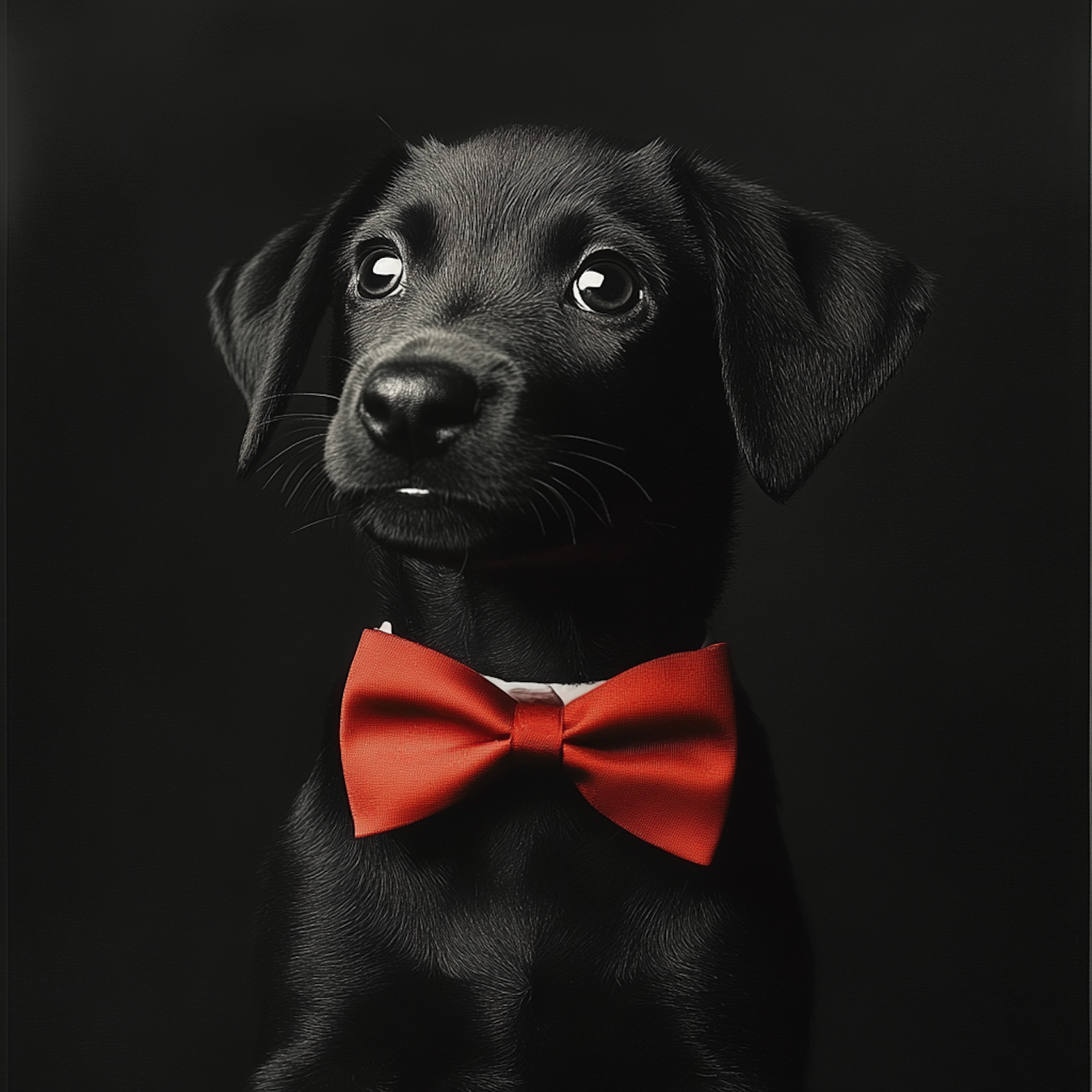 Adorable black puppy with a red bow tie, wide-eyed and curious against a dark background. Perfect blend of elegance and cuteness.