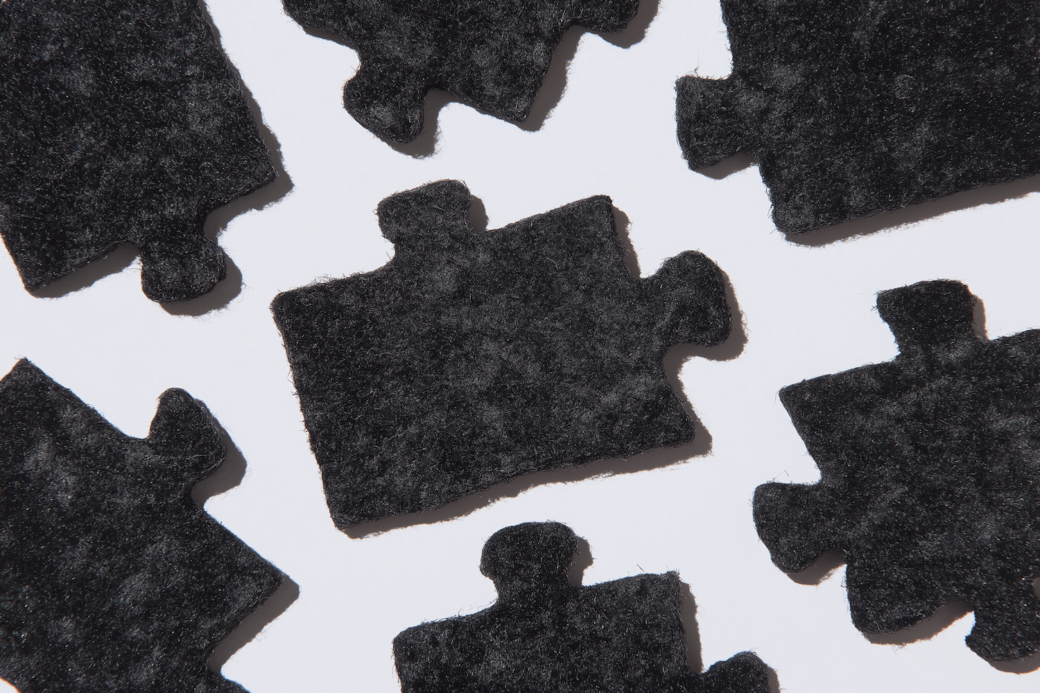 Close-up image of black felt-textured jigsaw puzzle pieces on a white surface, showcasing their unique shapes and contrasting textures.