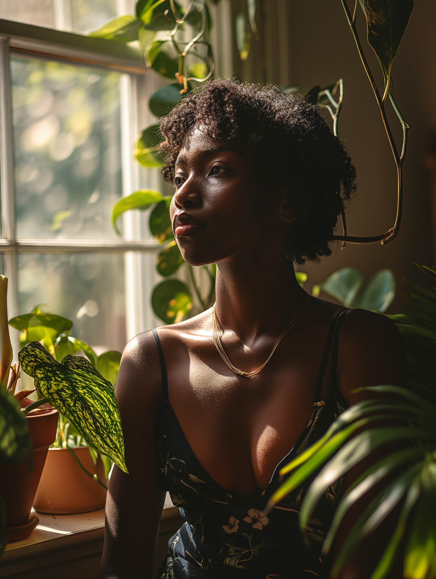 A serene Black woman in a floral dress sits by a sunlit window, surrounded by lush green plants, exuding tranquility and natural beauty.