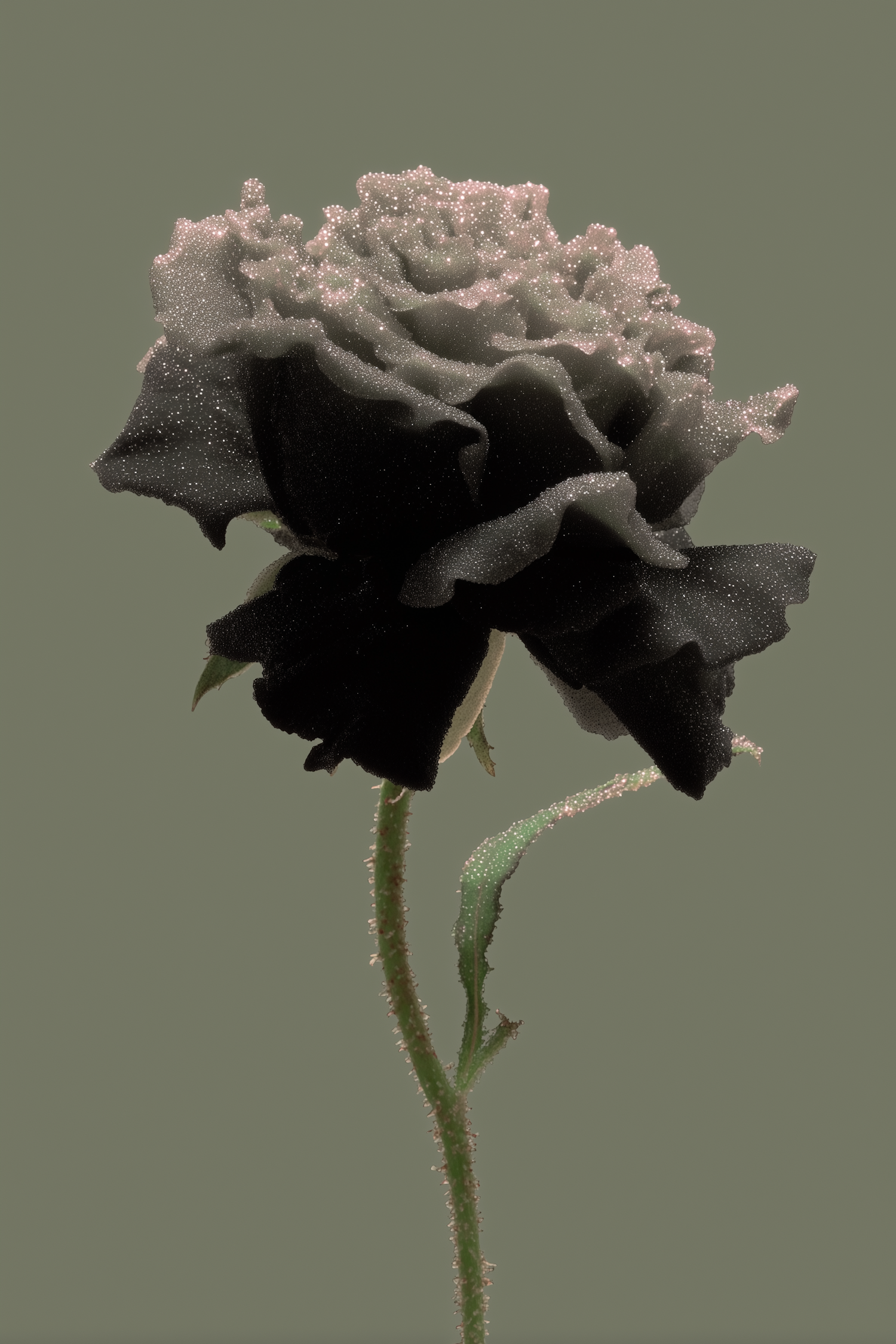 A stunning black rose adorned with dew drops, set against a soft green background, showcasing its intricate petals and natural elegance.