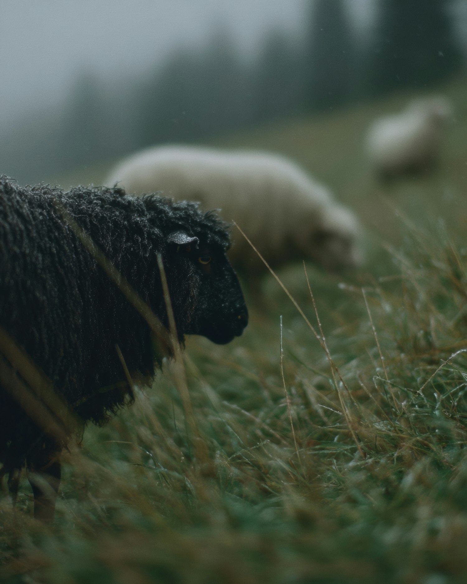 A black sheep in focus on a misty meadow, surrounded by dewy grass and grazing sheep in the blurred background.