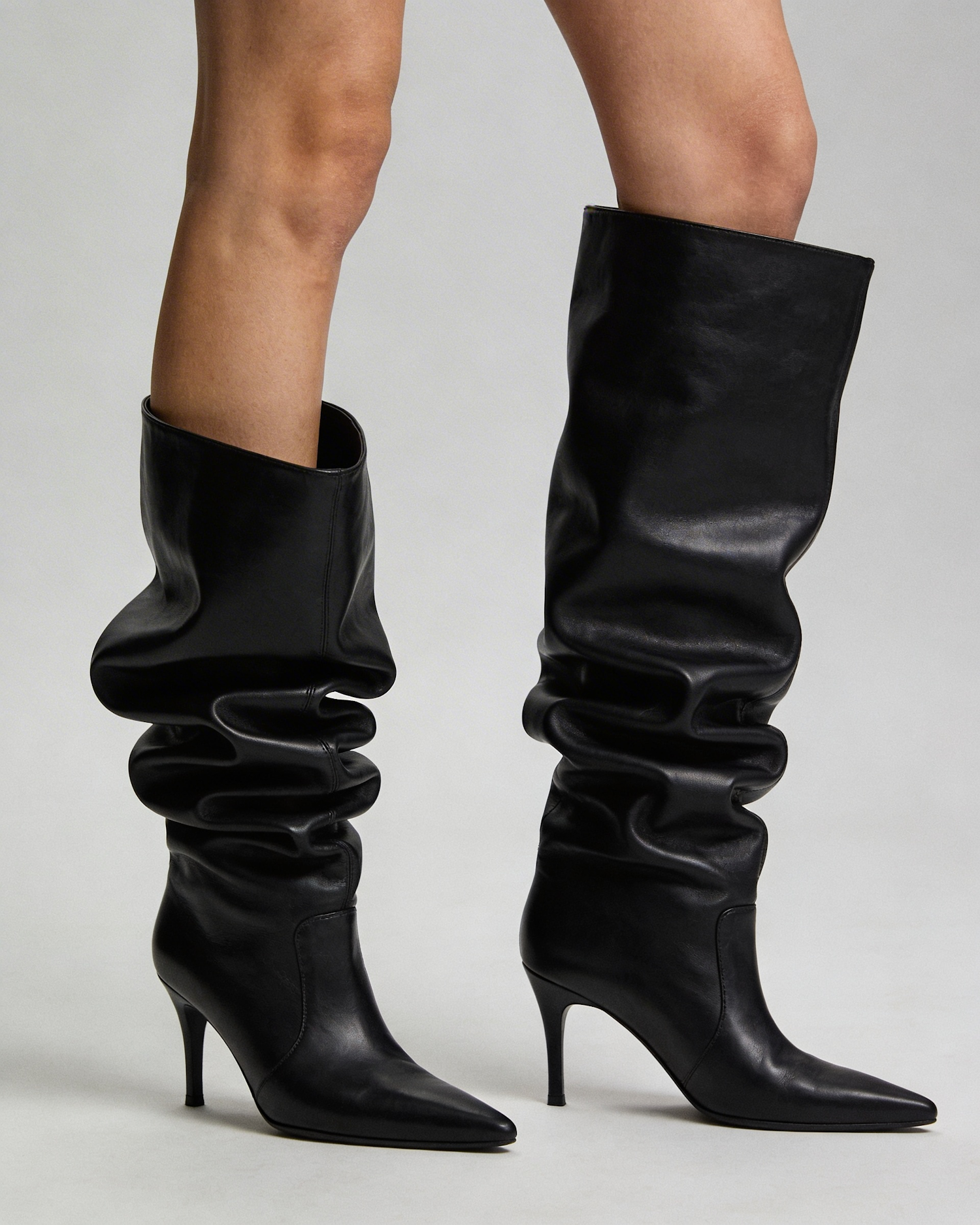 Stylish black leather slouch boots with pointed toes and stiletto heels, perfect for a chic and modern look.