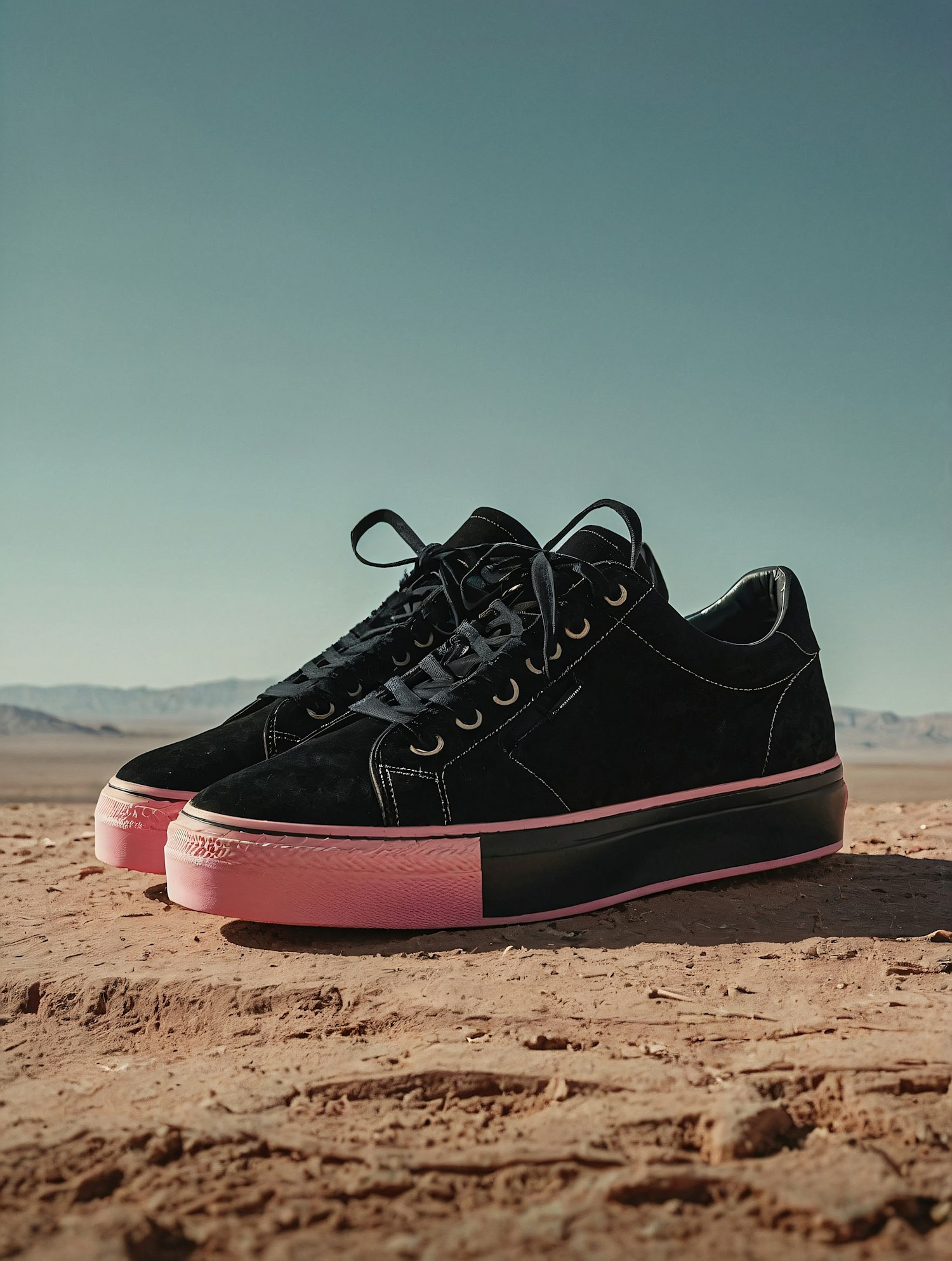 Black sneakers with pink soles on desert terrain, set against a clear blue sky and distant mountains, highlighting their stylish design.