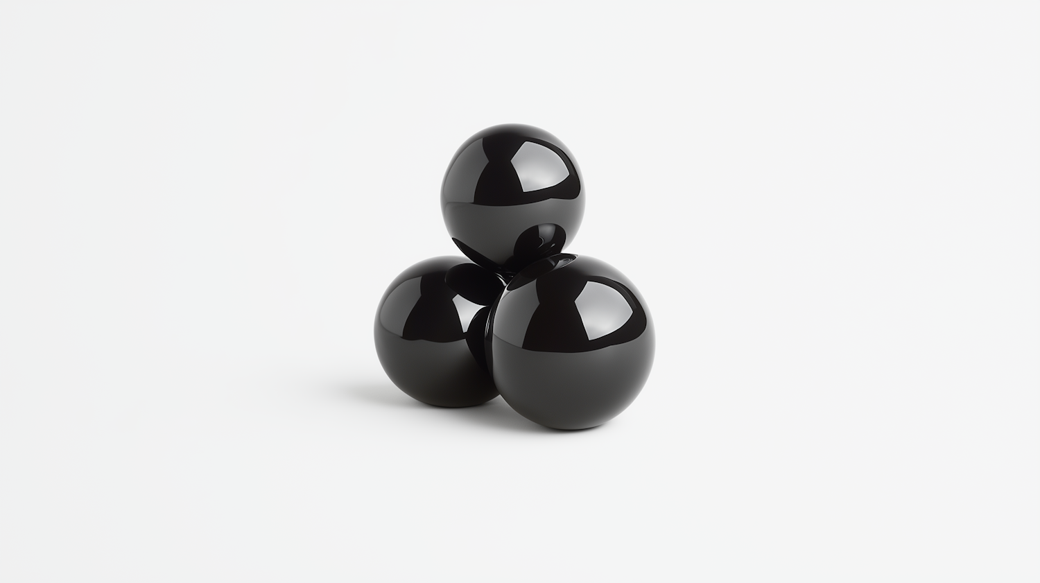 Three glossy black spheres artistically stacked against a white background, reflecting light for a striking minimalist visual.