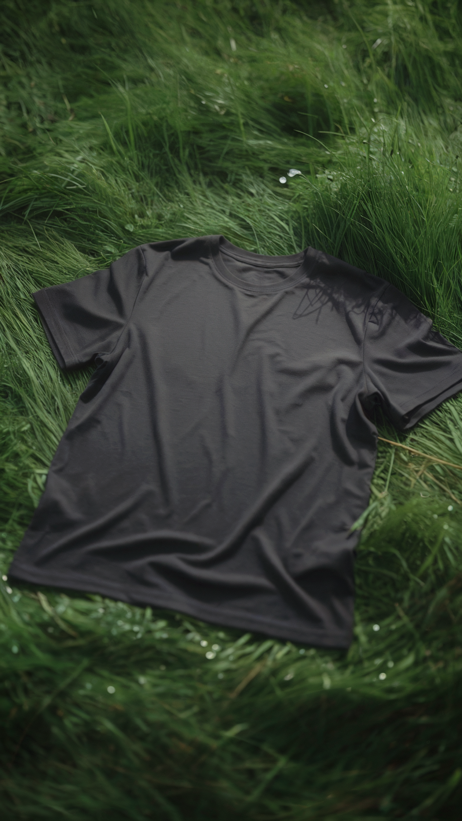 Black T-shirt laid on vibrant green grass with soft lighting, showcasing its smooth texture and natural outdoor setting.