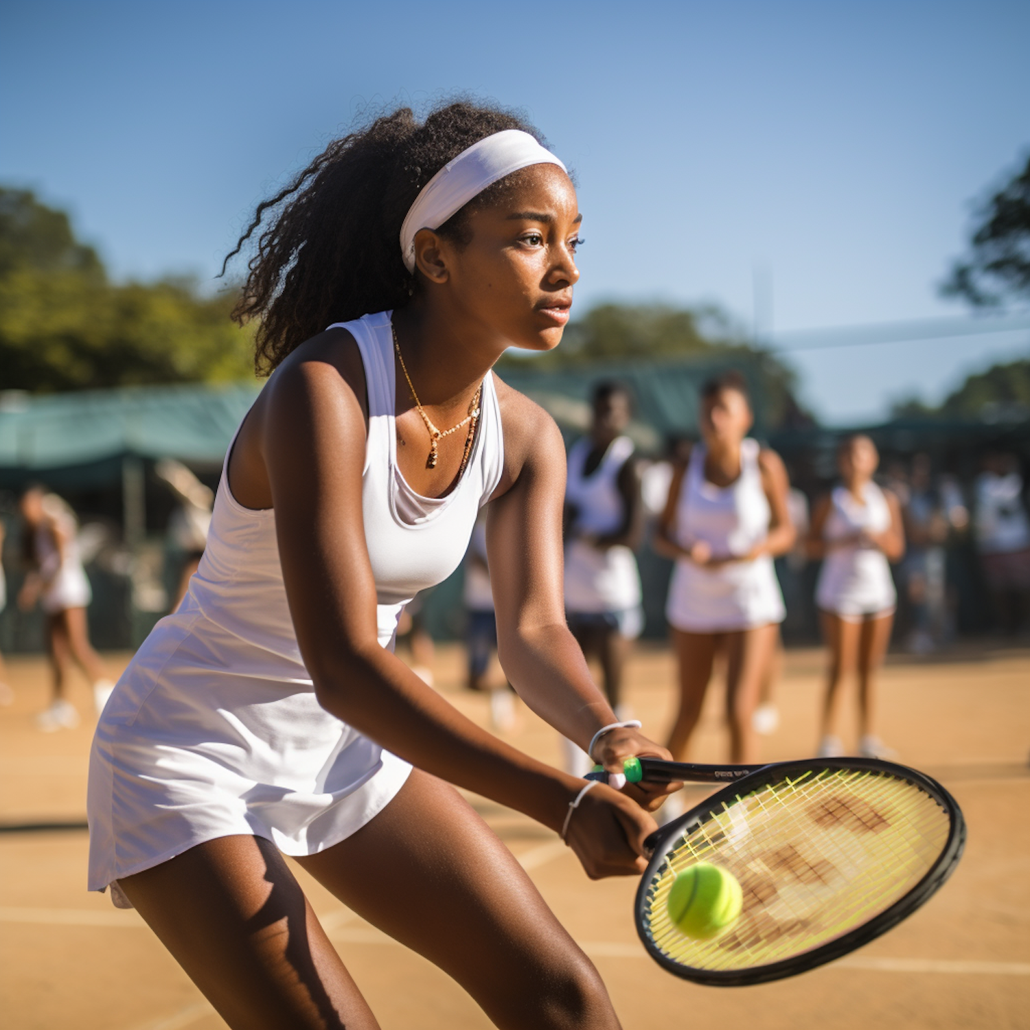 Focused young tennis player in white attire prepares to return a ball on a sunny outdoor clay court, with teammates in the background.