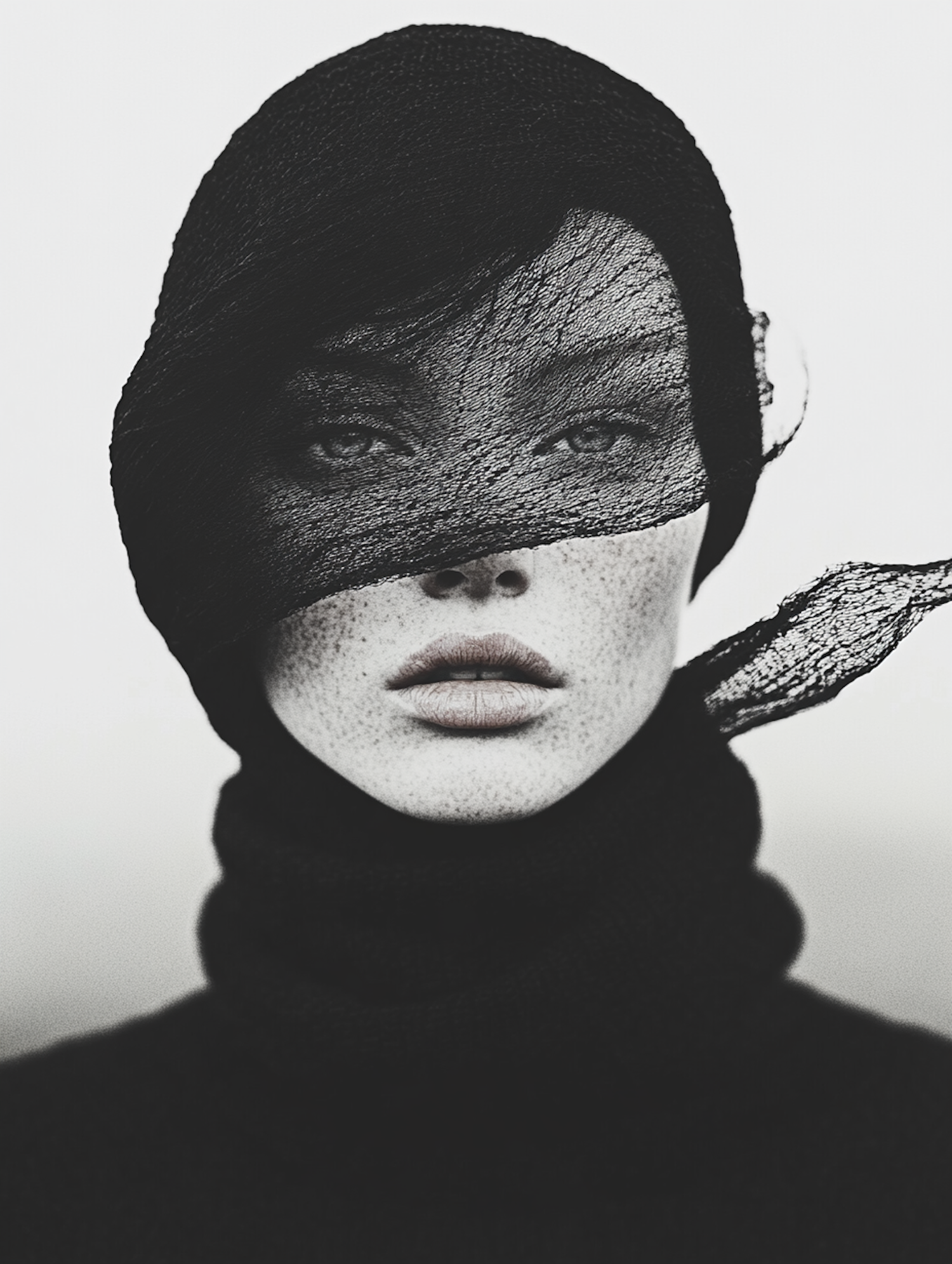 Black-and-white portrait of a freckled woman in a black veil and turtleneck, exuding mystery and elegance with piercing eyes.