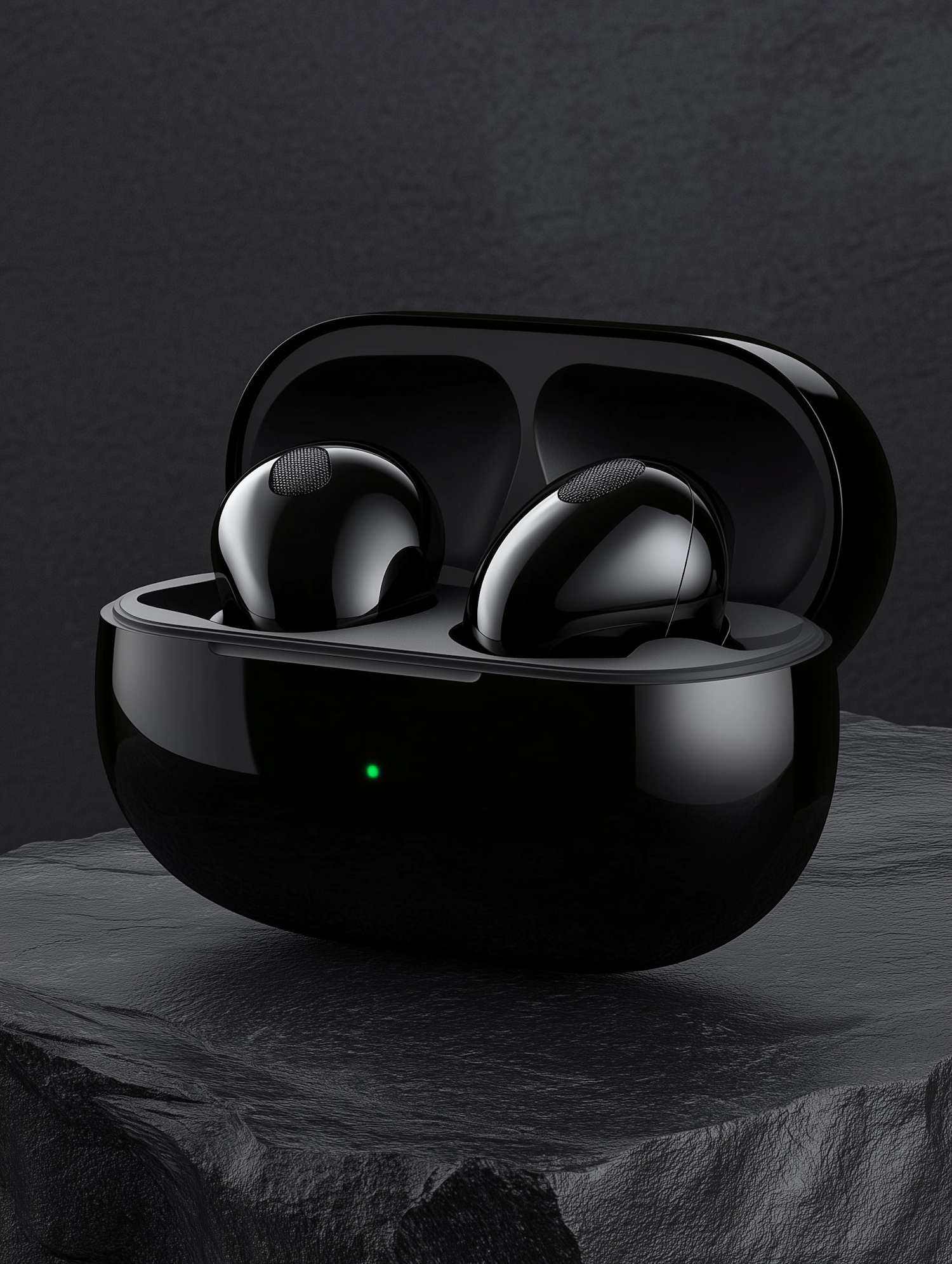 Glossy black wireless earbuds in a matching charging case with a green LED, set on a textured dark stone surface.