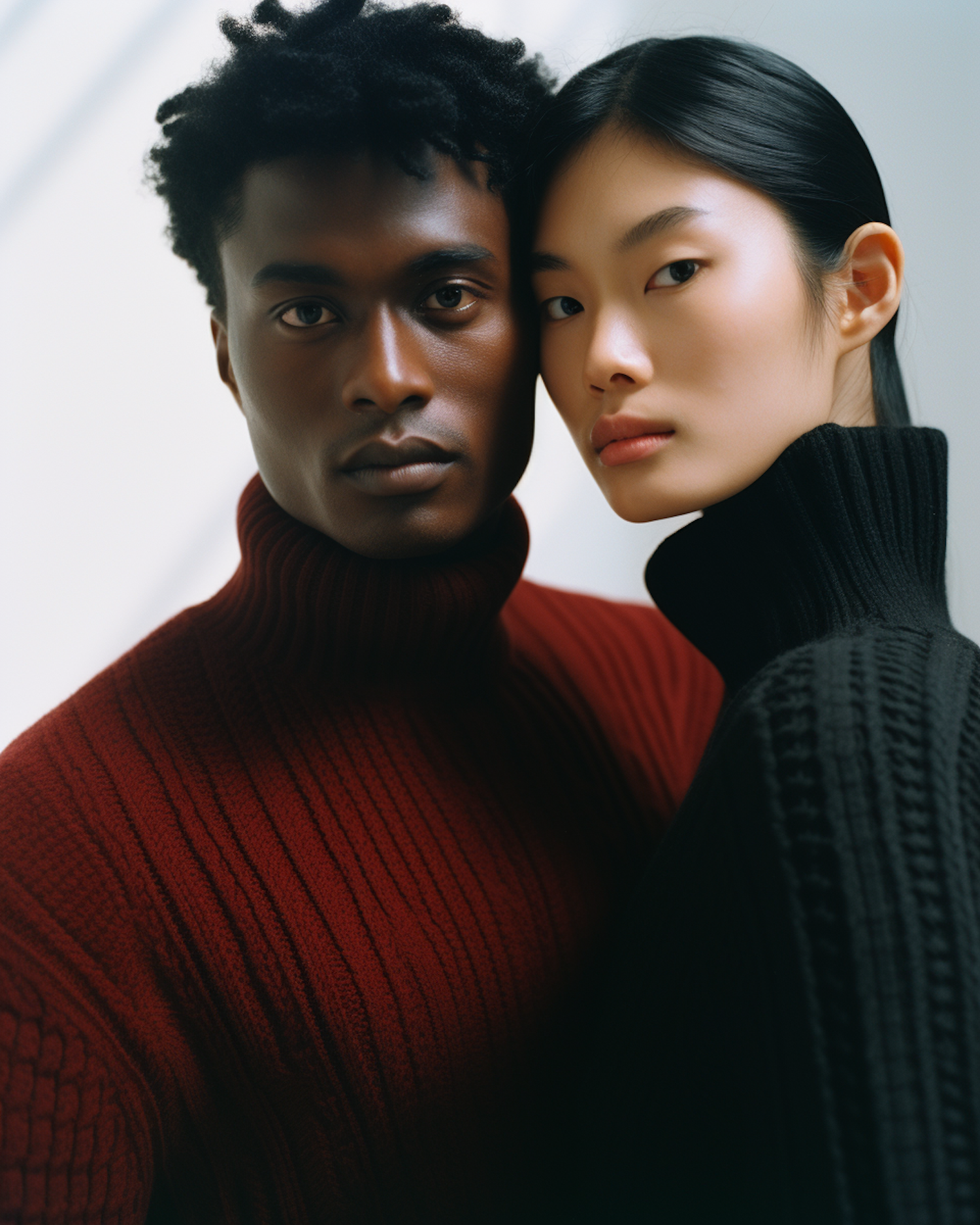 Close-up portrait of a Black man and Asian woman in ribbed sweaters, showcasing diverse beauty and fashion.