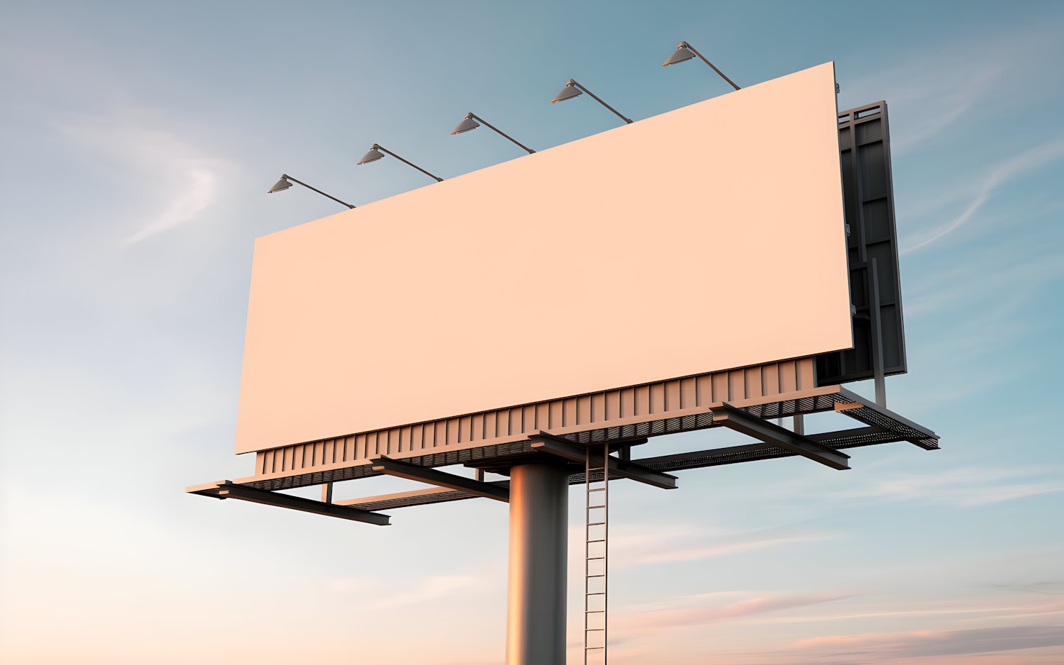 A blank beige billboard with overhead lights stands against a serene sky, perfect for advertising or creative design mockups.
