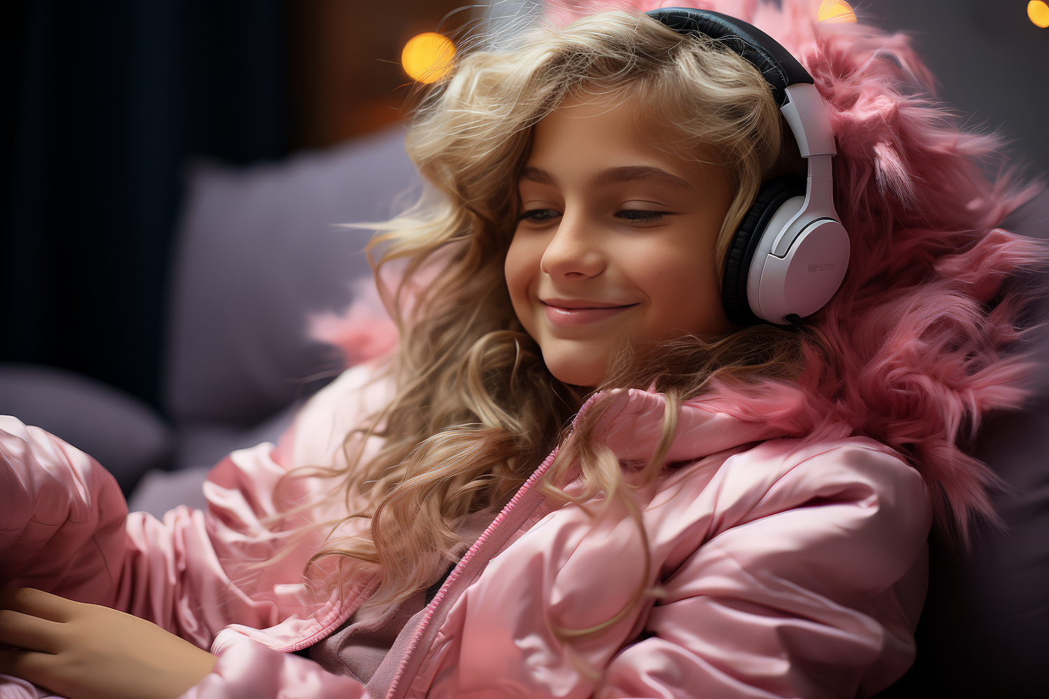Young girl with blonde curls in a pink jacket, enjoying music with headphones. Cozy and relaxed atmosphere with warm lighting.