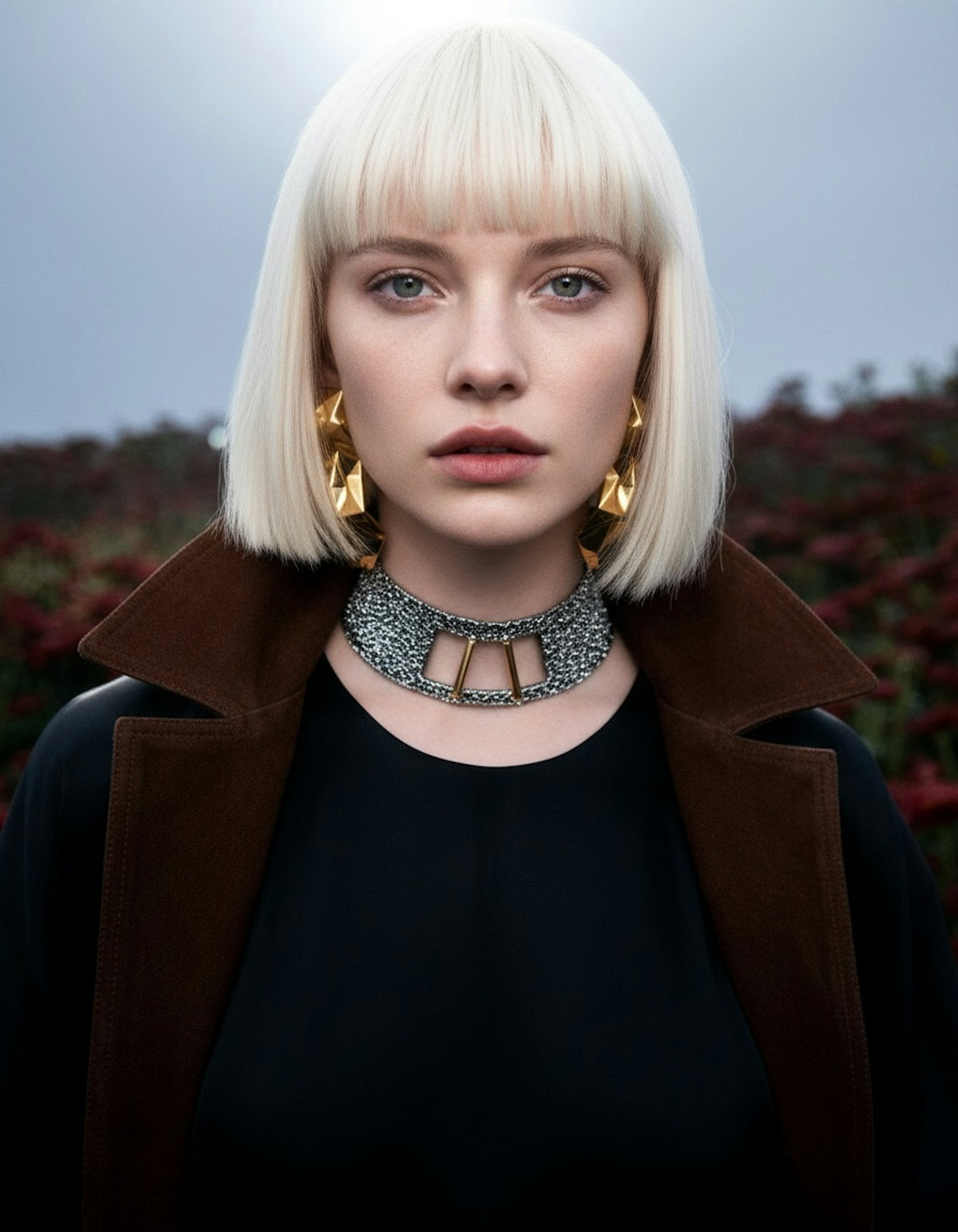A stylish woman with platinum blonde hair, wearing a brown coat and bold accessories, stands against a soft outdoor background.
