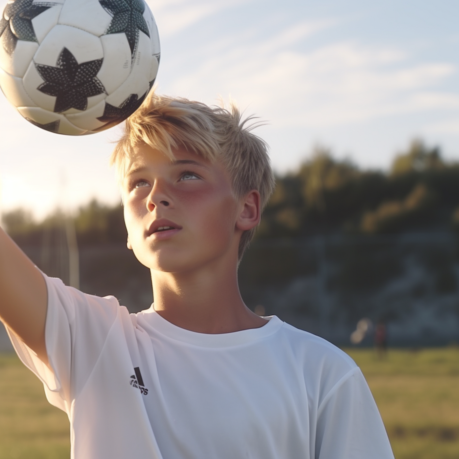 Blonde boy in a white Adidas shirt balances a soccer ball outdoors, bathed in warm sunlight with a grassy field in the background.