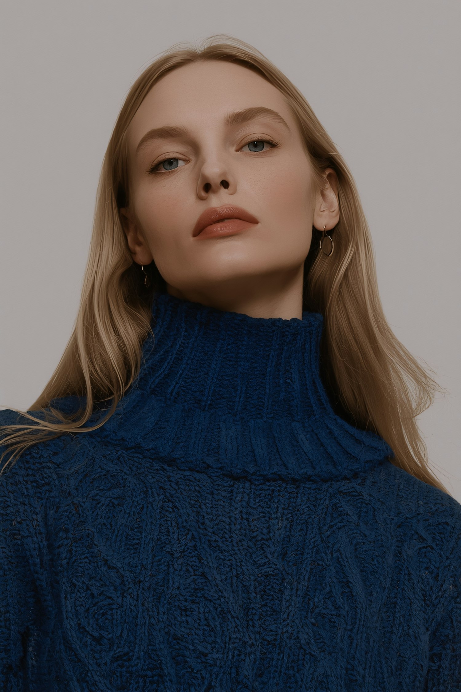 A person with blonde hair in a blue turtleneck sweater, showcasing a stylish and cozy look against a neutral background.