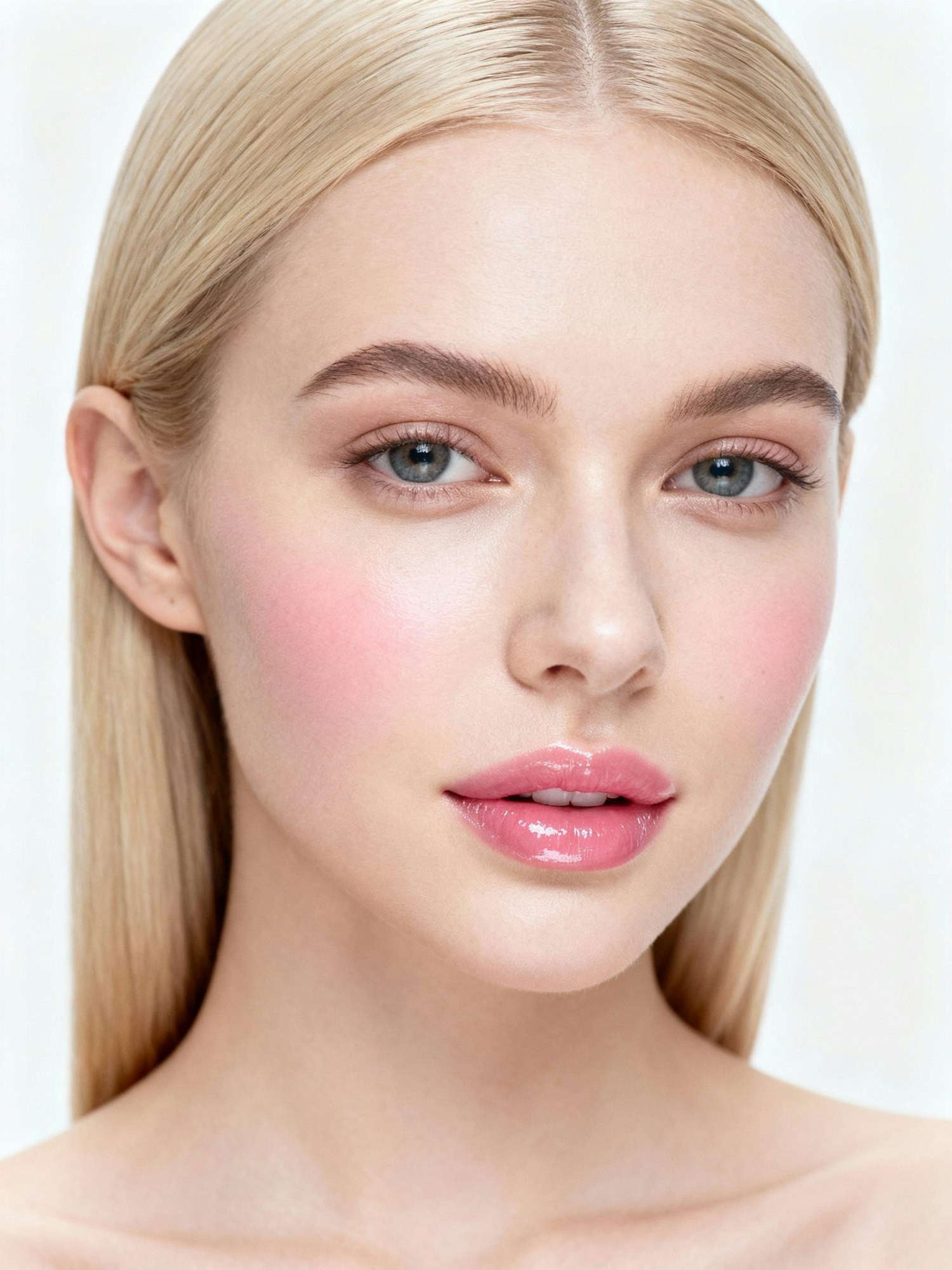 beauty studio portrait style composition featuring a person with fair features and sleek blonde hair, soft pink tones across the skin giving a healthy flushed look, glossy natural lip finish, luminous even lighting, minimal and clean white background, modern editorial photography aesthetic inspired by skincare and clean makeup campaigns, focus on fresh glow, smooth textures and elegant simplicity