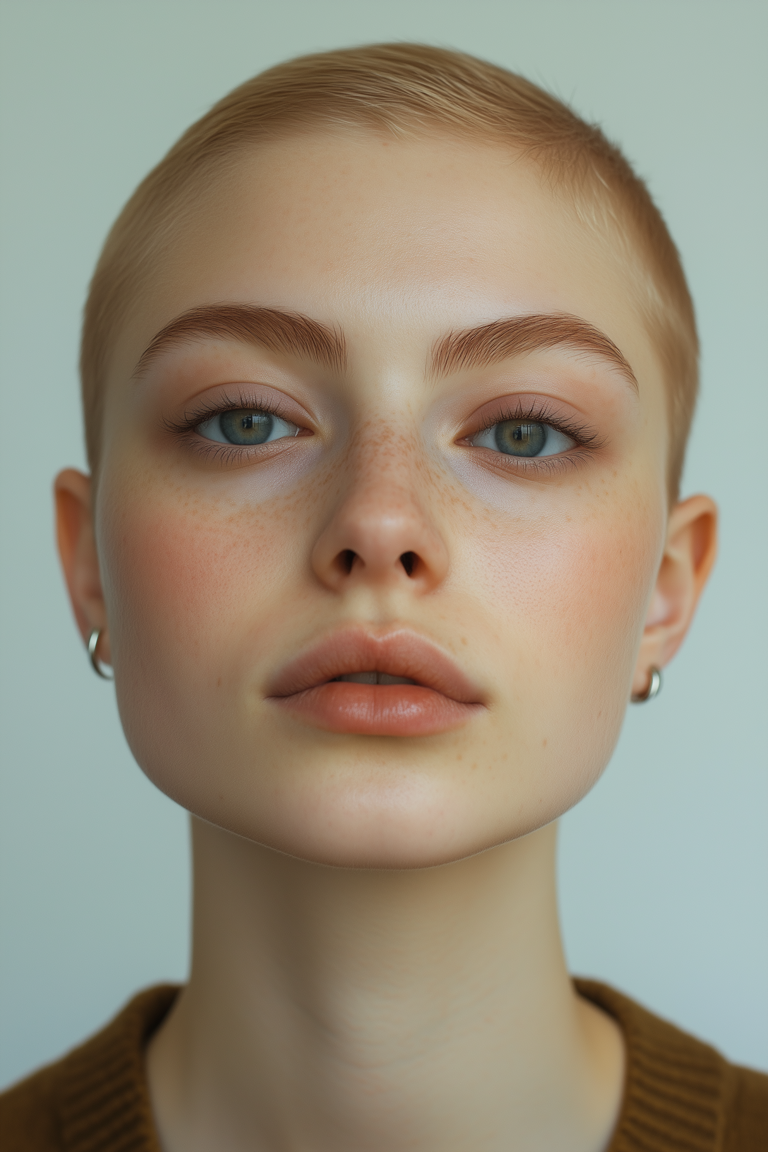 Close-up of a person with short blonde hair, green eyes, freckles, and silver hoop earrings against a soft green background.