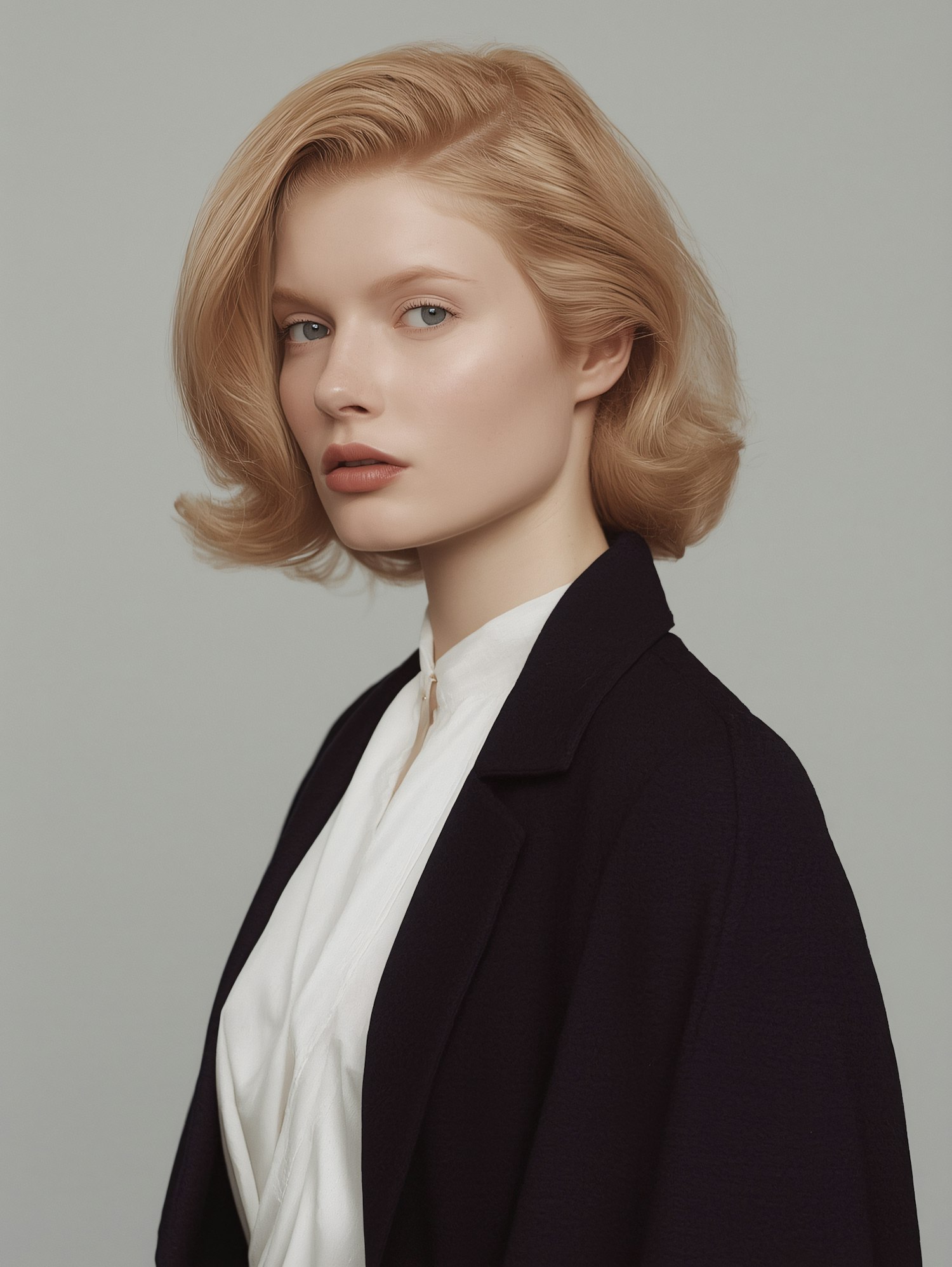 A stylish portrait of a person with blonde hair, wearing a dark blazer and white blouse, set against a neutral background.