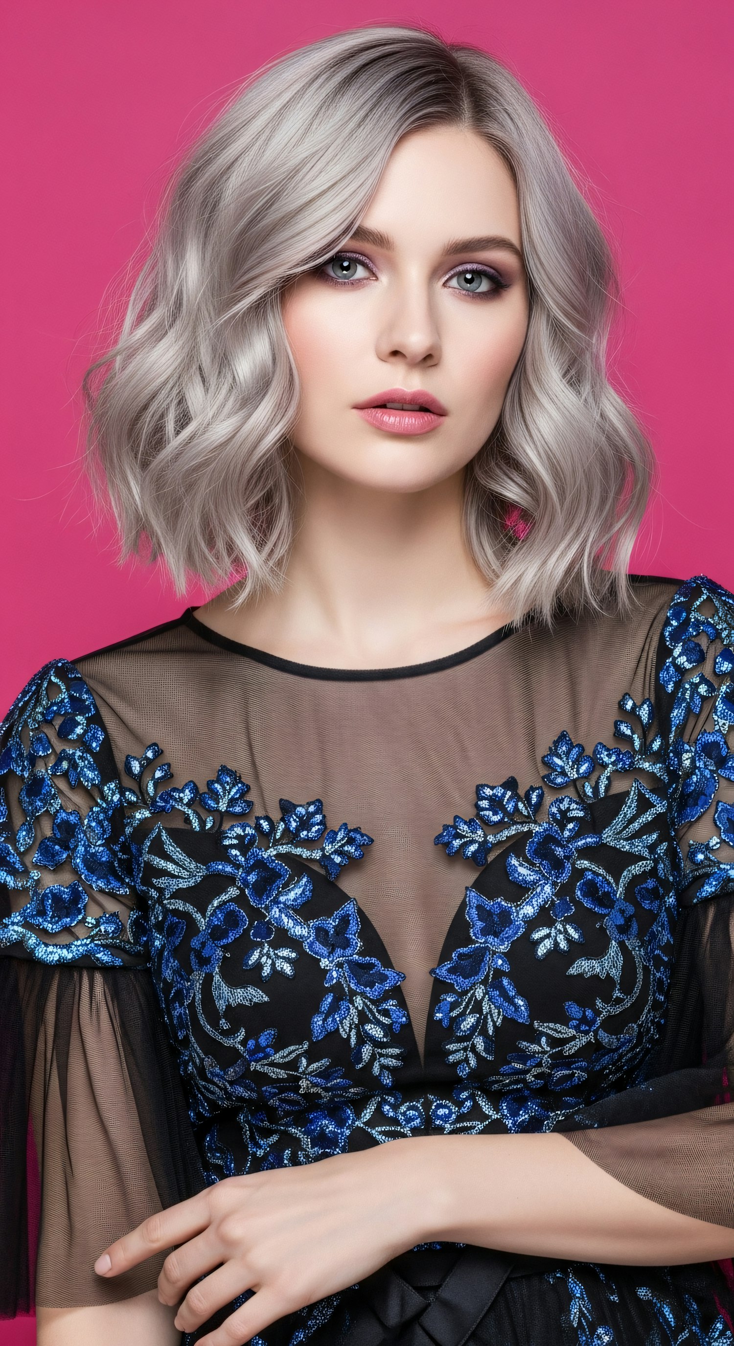 Stylish young woman with silver blonde hair, wearing a black lace dress with intricate blue floral patterns, standing against a vibrant pink background.