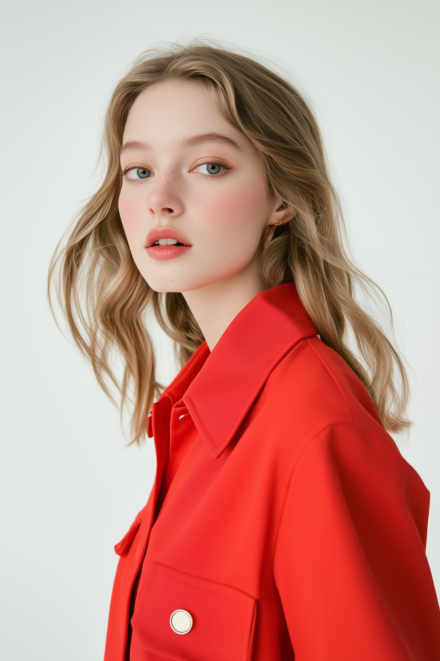 Blonde woman with soft waves, blue eyes, and a red jacket with metallic buttons, posing against a neutral background.
