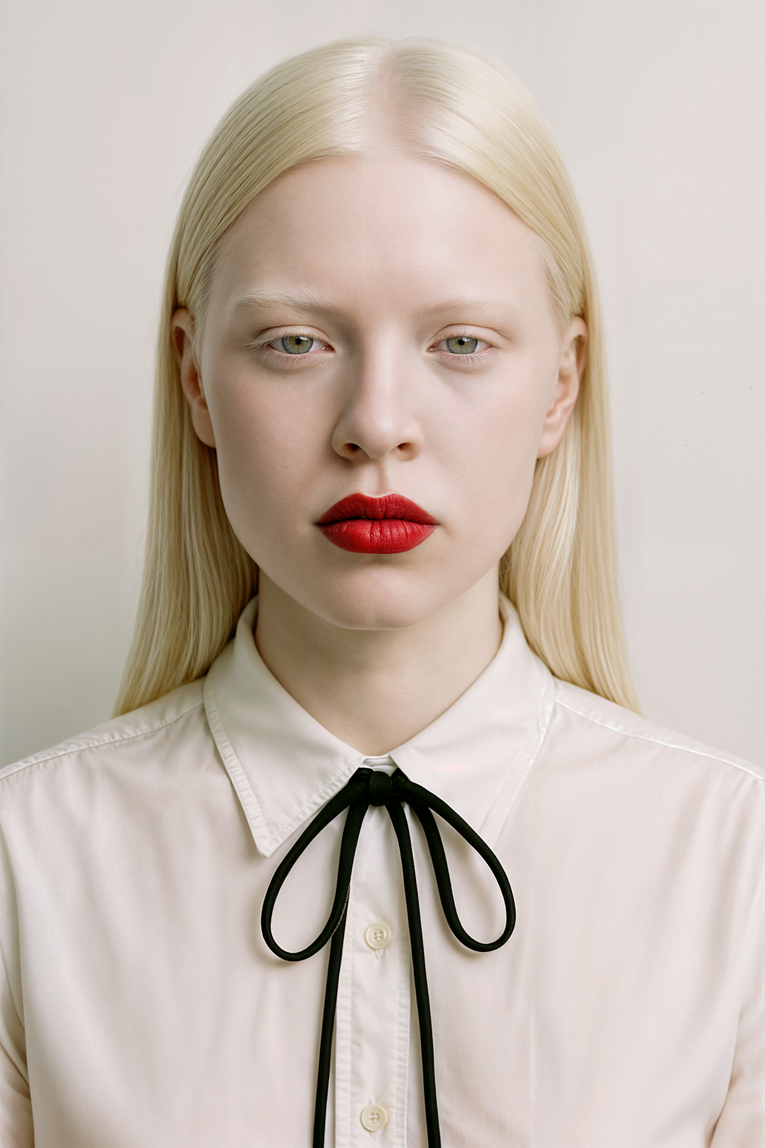 Striking portrait of a platinum blonde woman with red lipstick, wearing a white shirt and black ribbon bow against a neutral background.
